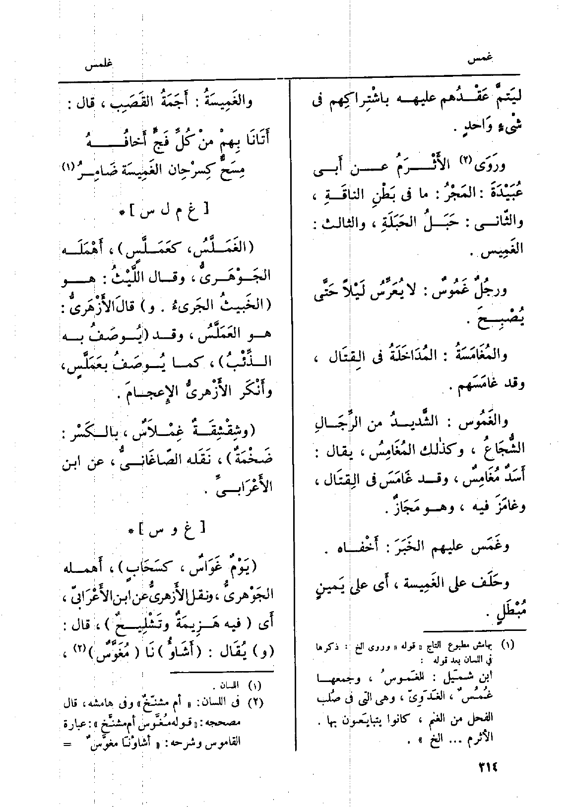 والمُغَامَسَةُ: المُدَاخَلَةُ فِي القِتَال، وَقد غامَسَهم. والغَمُوس: الشَّديدُ من الرِّجَالِ الشُّجَاعُ، وَكَذَلِكَ المُغَامِسُ، يُقَال: أَسَدٌ مُغَامِسٌ، وَقد غَامَسَ فِي القِتَال، وغامَزَ فِيهِ، وَهُوَ مَجَازٌ. وغَمسَ عَلَيْهِم الخَبَرَ: أخْفاه. وحَلَف على الغَمِيسة، أَي على يَمينٍ مُبْطَلٍ. والغَمِيسَةُ: أَجَمَةُ القَصَبِ، قَالَ: