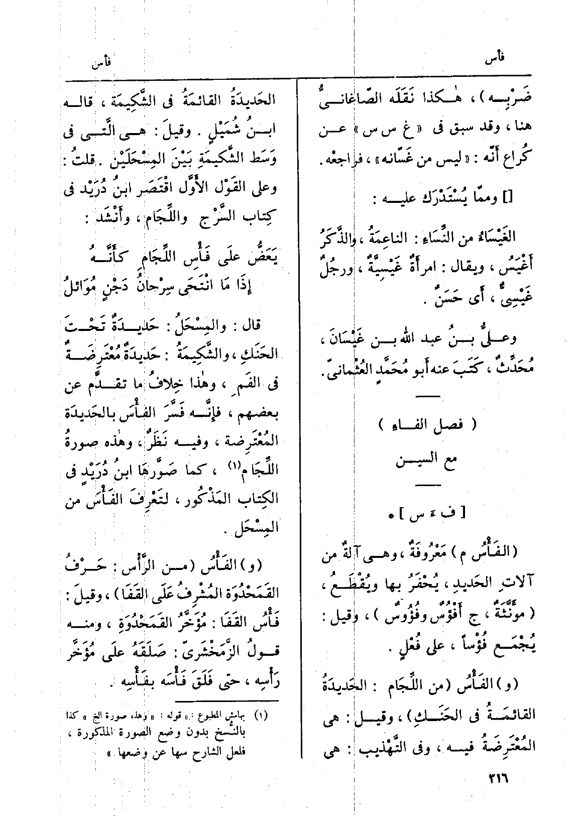 قَالَ: والمِسْحَل: حَدِيدَةٌ تَحْتَ الحَنَكِ، والشَّكِيمَةُ: حَديدَةٌ مُعْتَرِضَةٌ فِي الفَمِ، وَهَذَا خِلافُ مَا تقدَّم عَن بَعضهم، فإِنَّه فَسَّرَ الفأْسَ بالحَديدَة المُعْتَرِضَة، وَفِيه نَظَرٌ، وَهَذِه صورةُ اللِّجَام، كَمَا صَوَّرهَا ابنُ دُرَيْدٍ فِي الكِتاب المَذْكُور، لتَعْرِفَ الفَأْسَ من المِسْحَل. والفَأْسُ من الرَّأْس: حَرْفُ القَمَحْدُوَة المُشْرِفُ عَلَى القَفَا، وقيلَ: فَأْسُ القَفَا: مُؤَخَّرُ القَمَحْدُوَةِ، وَمِنْه قَوْلُ الزَّمَخْشَرِيّ: صَلَقَهُ علَى مُؤَخَّر رَأْسِه، حَتَّى فَلَقَ} فَأْسَه! بفَأْسِه.