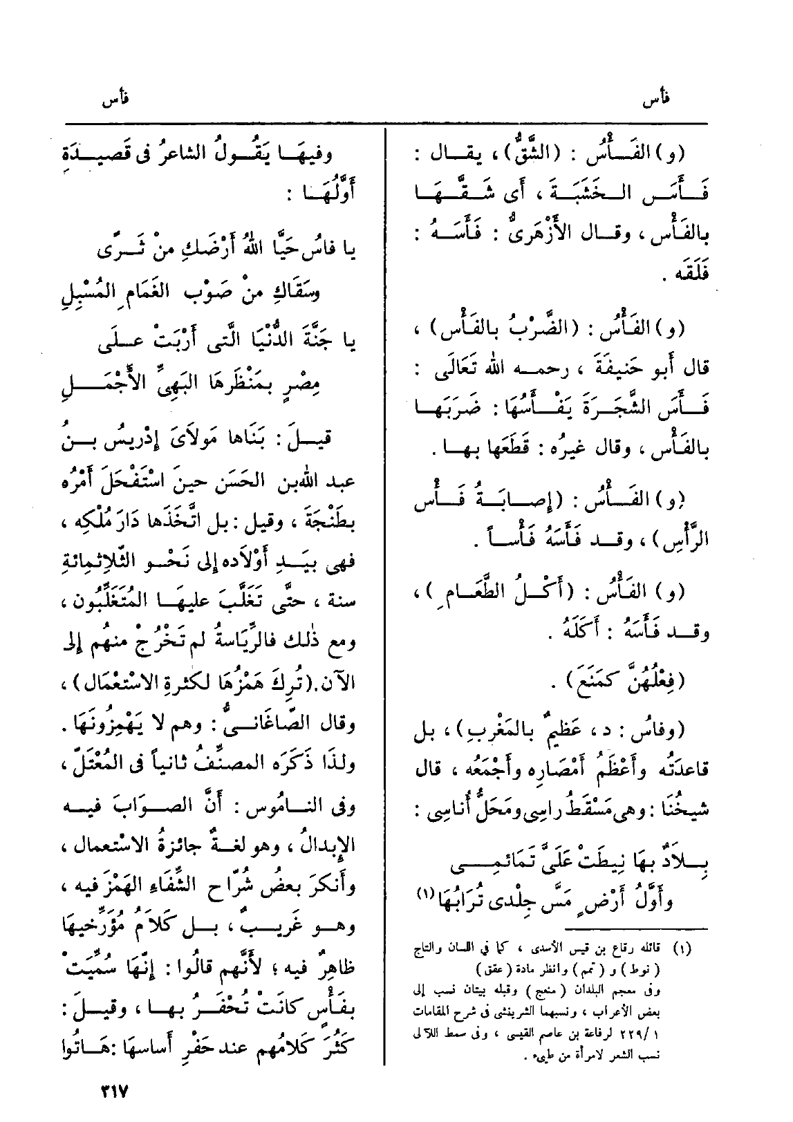 لغةٌ جائزةُ الِاسْتِعْمَال، وأَنكَرَ بعضُ شُرّاح الشِّفَاءِ الهَمْزَ فِيهِ، وَهُوَ غَريبٌ، بل كَلاَمُ مُؤَرِّخِيهَا ظاهِرٌ فِيهِ، لأَنَّهم قالُوا: إِنَّها سُمِّيَتْ! بفَأْسٍ كانَتْ تُحْفَرُ بهَا، وقيلَ: كَثُرَ كَلامُهم عِنْد حَفْرِ أَساسَهَا: هَاتُوا