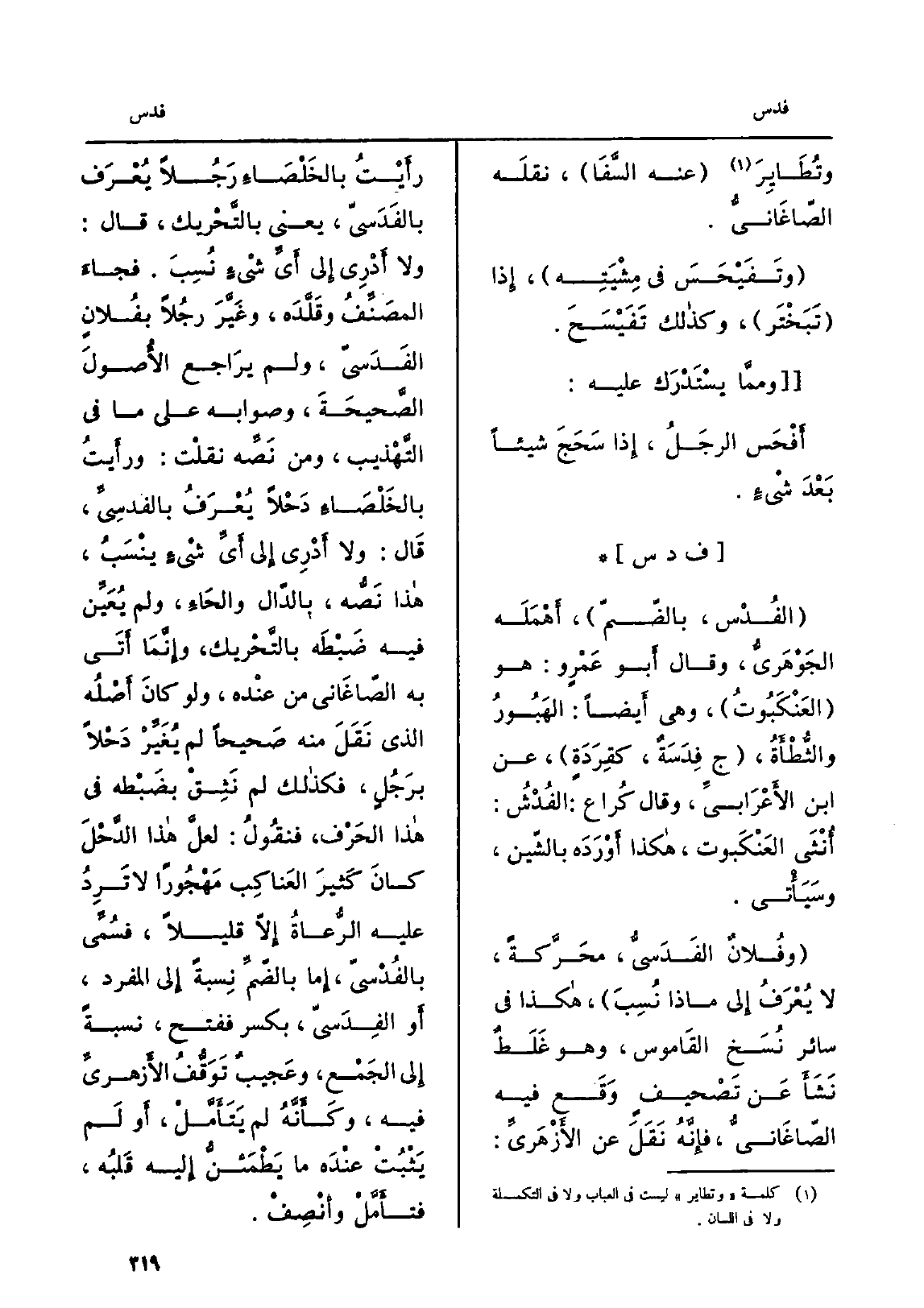 الفُدْس، بالضّمّ، أَهْمَلَه الجَوْهَرِيُّ، وَقَالَ أَبو عَمْرٍ و: هُوَ العَنْكَبُوتُ، وَهِي أَيضاً: الهَبُورُ والثُّطْأَةُ، ج فِدْسَة، كقِرَدَةٍ، عَن ابْن الأَعْرَابيِّ، وَقَالَ كُراع: الفُدْشُ: أُنْثَى العَنْكَبُوت، هَكَذَا أَوْرَدَه بالشّين، وسَيَأْتِي. وفُلانٌ الفَدَسيُّ، محَرَّكةً، لَا يُعْرَفُ إِلى مَاذَا نُسِبَ، هَكَذَا فِي سَائِر نُسَخ القَاموس، وَهُوَ غَلَطٌ نَشَأَ عَن تَصْحِيفٍ وَقَع فِيهِ الصّاغَانِيُّ، فإِنَّه نَقَلَ عَن الأَزْهَرِيُّ: رَأيْتُ بالخَلْصَاءِ رَجُلاً يُعْرَف بالفَدَسيّ، يَعْنِي بالتَّحْريك، قَالَ: وَلَا أَدْرِي إِلى أَيِّ شيْءٍ نُسِبَ. فجاءَ المصَنِّفُ وقَلَّدَه، وغَيَّرَ رجُلاً بفُلانٍ الفَدَسيّ، وَلم يرَاجع الأُصولَ الصَّحيحَةَ، وَصَوَابه على مَا فِي التَّهْذيب، وَمن نَصِّه نقلْت: ورأَيتُ بالخَلْصَاءِ دَحْلاً يُعْرَفُ بالفدسِيُّ، قَال: وَلَا أَدْرِي إِلى أَيِّ شيءٍْ ينْسَبُ، هَذَا نَصُّه، بالدّال والحَاءِ، وَلم يُعَيِّن فِيهِ ضَبْطَه بالتَّحْريك، وإِنَّمَا أَتَى بِهِ الصّاغَانِيُّ من عنْده، وَلَو كانَ أَصْلُه الَّذِي نَقَلَ مِنْهُ صَحيحاً لم يُغَيِّرْ دَحْلاً برَجُلٍ، فَكَذَلِك لم نَثِقْ بضَبْطه فِي هَذَا الحَرْف، فنقُولُ: لعلَّ هَذَا الدَّحْلَ كانَ كَثيرَ العَناكِب مَهْجُوراً لَا تَرِدُ عَلَيْهِ الرُّعاةُ إِلاّ قَلِيلا، فسُمِّي بالفُدْسيّ، إِما بالضّمِّ نِسبةً إِلى الْمُفْرد، أَو الفِدَسيّ، بِكَسْر فَفتح، نِسْبَة إِلى الجَمْع، وعَجِيبٌ تَوَقُّفُ الأَزْهَرِيُّ فِيهِ، وكَأَنَّهُ لم يَتَأَمَّلْ، أَو لَم يَثْبُتْ عنْدَه مَا يَطْمَئنُّ إِليه قَلبُه، فتأَمَّلْ وأنْصِفْ.