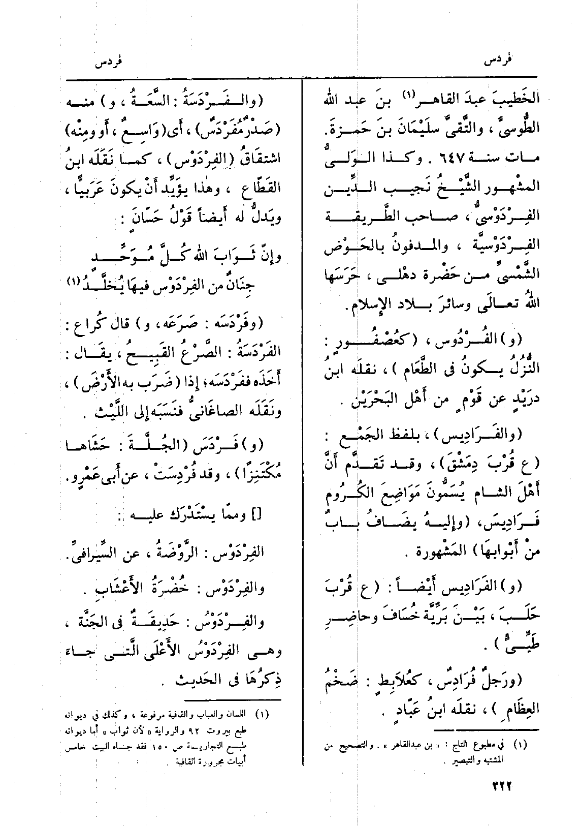 الطَّريقة الفِرْدَوْسيَّة، والمدفونُ بالحَوْض الشَّمْسيِّ من حَضْرة دهْلي، حَرَسَها الله تعالَى وسائرَ بِلَاد الإِسلام. والفُرْدُوس كعُصْفُورٍ: النُّزُلُ يكونُ فِي الطَّعَام، نقلَه ابنُ درَيْدٍ عَن قَوْمٍ من أَهْل البَحْرَيْن. والفَرَادِيس، بِلَفْظ الجَمْع: ع قُرْبَ دِمَشْقَ، وَقد تَقدَّم أَنَّ أَهْلَ الشَّام يُسَمُّونَ مَوَاضِعَ الكُرُوم فَرَادِيسَ، وإِليه يُضَافُ بابٌ منْ أَبْوابهَا المَشْهورة. والفَرَادِيس أَيْضاً: ع قُرْبَ حَلَبَ، بَيْنَ بَرِّيَّة خُسَافَ وحاضِرِ طَيِّءٍ. ورَجُلٌ فُرَادِسٌ، كعُلاَبِطٍ: ضَخْمُ العِظَامِ، نقلَه ابنُ عَبّادٍ. والفَرْدَسَةُ: السَّعَةُ، وَمِنْه صَدْرٌ مُفَرْدَسٌ، أَي وَاسِعٌ، أَو ومِنْه اشْتقَاقُ الفِرْدَوْس، كَمَا نَقَلَه ابنُ القَطّاع، وَهَذَا يؤَيِّد أنْ يكونَ عَرَبيّاً، ويَدلُّ لَهُ أَيضاً قَوْلُ حَسّانٍ: