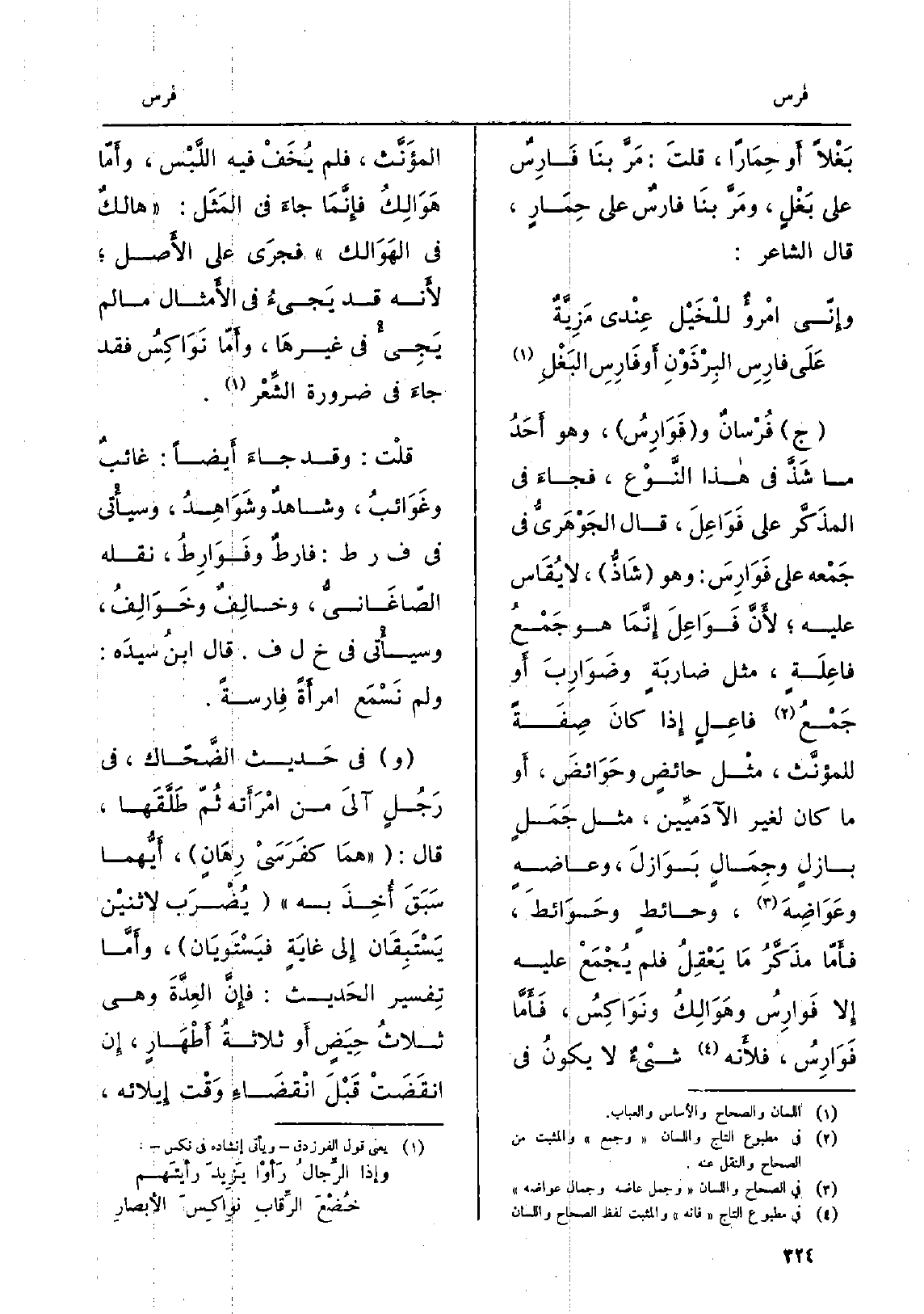 ج فُرْسان وفَوَارِسُ، وَهُوَ أَحَدُ مَا شَذَ فِي هَذَا النَّوْع، فجاءَ فِي المذَكَّر على فَوَاعِلَ، قَالَ الجَوْهَريُّ فِي جَمْعه على فَوَارِسَ: وَهُوَ شاذُّ، لَا يُقَاس عَلَيْهِ، لأَنَّ فَوَاعِلَ إِنَّمَا هُوَ جَمْعُ فاعِلَةٍ، مثل ضاربَةٍ وضَوَارِبَ أَو جَمْعُ فاعِلٍ إِذا كانَ صِفَةً للمُؤَنَّث، مثْل حائِضٍ وحَوَائضَ، أَوما كَانَ لغير الآدَميِّين، مثل جَمَلٍ بازِلٍ وجِمَالٍ بَوَازلَ، وعاضِهٍ وعَواضِهَ، وحائِطٍ وحَوائطَ، فأَمّا مذَكَّرُ مَا يَعْقِلُ فَلم يُجْمَعْ عَلَيْهِ إِلا فَوارِسُ وهَوَالِكُ ونَوَاكِسُ، فَأَمَّا فَوَارِسُ، فلأَنه شيْءٌ لَا يكونُ فِي المؤَنَّث، فَلم يُخَفْ فِيهِ اللَّبْس، وأَمّا هَوَالِكُ فإِنَّما جاءَ فِي المَثَل: هالكٌ فِي الهَوَالك فجرَى على الأَصل، لأَنه قد يَجيءُ فِي الأَمثال مَا لم يَجِيءْ فِي غيرهَا، وأَمّا نَوَاكِسُ فقد جاءَ فِي ضَرُورَة الشِّعْر. قلْت: وَقد جاءَ أَيضاً: غائبٌ وغَوَائبُ، وشاهدٌ وشَوَاهِدُ، وسيأْتي فِي ف ر ط: فارطٌ وفَوَارِطُ، نَقله الصّاغَانِيُّ، وخالِفٌ وخَوَالِفُ، وَسَيَأْتِي فِي خَ ل ف. قَالَ ابنُ سيدَه: وَلم نَسْمَع امرأَةً فارسةً. وَفِي حَديث الضَّحّاك، فِي رَجُلٍ آلَى من امْرَأَته ثُمّ طَلَّقَها، قَالَ: همَا كفَرسَيْ رِهَانٍ، أَيُّهما سَبَقَ أُخِذَ بِهِ يُضْرَب لاثنيْن يَسْتَبِقَان إِلى غَايَةٍ فيَسْتَوِيَان، وأَمَّا تَفْسِير الحَديث: فإِنَّ العِدَّةَ وَهُوَ ثلاثُ حِيَضٍ أَو ثلاثةُ أَطْهَارٍ، إِن انقَضَتْ قَبْلَ انْقَضَاءِ وقْت إِيلائه،