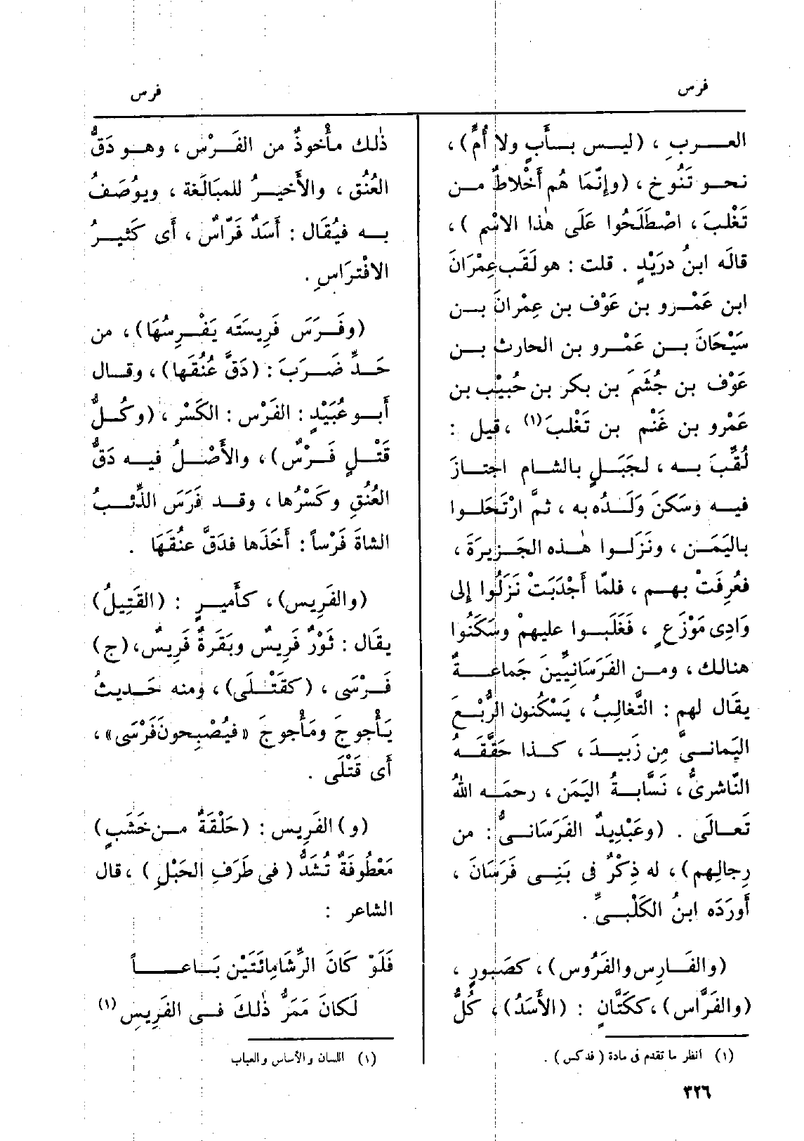 العربِ، لَيْسَ بأَبٍ وَلَا أُمٍّ، نَحْو تَنُوخ، وإِنّمَا هُم أَخْلاطٌ من تَغْلبَ، اصْطَلَحُوا عَلَى هَذَا الاسْم، قالَه ابنُ درَيْدٍ. قلت: هُوَ لَقَب عِمْرَانَ ابْن عَمْرو بن عَوْف بن عِمْران بن سَيْحَانَ بن عَمْرو الْحَارِث بن عَوْف بن جُشَمَ بن بكر بن حُبَيْب بن عَمْرو بن غَنْم بن تَغْلبَ، قيل: لُقِّبَ بِهِ، لجَبَلٍ بِالشَّام اجتازَ فِيهِ وسَكنَ وَلَدُ بِهِ، ثمَّ ارْتَحَلوا باليَمَن، ونَزَلوا هَذِه الجَزِيرَةَ، فعُرِفَتْ بهم، فلمّا أَجْدَبَتْ نَزَلُوا إِلى وَادِي مَوْزَعٍ، فغَلَبوا عليهمْ وسَكَنُوا هُنَالك، وَمن الفَرَسَانِيِّينَ جَماعةٌ يقَال لَهُم: التَّغالِبُ، يَسْكُنون الرُّبْعَ اليَمانيَّ مِن زَبيدَ، كَذَا حَقَّقُه الناَّشرىُّ، نَسَّابةُ اليَمَن، رحمَه اللهُ تَعالَى. وعَبْدِيدٌ الفَرَسَانيُّ: من رِجالِهم، لَهُ ذِكْرٌ فِي بَنِي فَرَسَانَ، أَورَدَه ابنُ الكلْبِيِّ. والفَارِس والفَرُوس، كصَبورٍ، والفَرَّاس، ككَتَّانٍ: الأَسَدُ، كُلُّ ذَلِك مأْخُوذٌ من الفَرْس، وَهُوَ دَقُّ العُنُق، والأخيرُ للمبَالَغة، ويُوصَفُ بِهِ فيُقَال: أَسَدٌ فَرّاسٌ، أَي كَثيرُ الافْتَرَاسِ. وفَرَسَ فَرِيِيسَتَه يَفْرِسُهَا، من حَدِّ ضَرَبَ: دَقَّ عُنُقَها، وَقَالَ أَبو عُبَيْدٍ: الفَرْس: الكَسْر، وكُلُّ قَتْلٍ فَرْسٌ، والأَصْلُ فِيهِ دَقُّ العُنُقِ وكَسْرُها، وَقد فَرَسَ الذِّئبُ الشاةَ فَرْساً: أَخَذَها فدَقَّ عنُقَهَا. والفَرِيسُ، كأَميرٍ: القَتِيلُ يقَال: ثَوْرٌ فَرِيسٌ وبَقَرةٌ فَرِيسٌ، ج فَرْسَى،، كقَتْلَى، وَمِنْه حَديثُ يأْجُوجَ ومأْجُوجَ فيُصْبِحُونَ فَرْسَى، أَي قَتْلَى.
