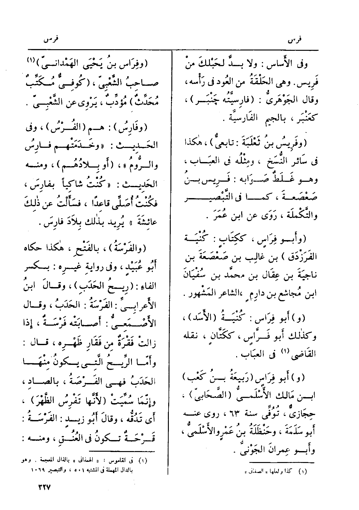 وَفِي الأَساس: وَلَا بدَّ لحَبْلكَ منْ فَرِيس. وَهُوَ الحَلْقَةُ من العُود فِي رَأْسه، وَقَالَ الجَوْهَرِيُّ: فارِسيَّتُه جَنْبَر، كعَنْبَر، بِالْجِيم الفَارِسيَّة. وفَرِيسُ بنُ ثَعْلَبَةَ: تابعيُّ، هَكَذَا فِي سَائر النُّسَخ، ومِثْلُه فِي العبَاب، وَهُوَ غَلَطٌ صَوَابه: فَرِيس بنُ صَعْصَعةَ، كَمَا فِي التَّبْصِير والتَّكْملَة، رَوَى عَن ابْن عُمَرَ. وأَبو فِرَاسٍ، ككِتَابٍ: كُنْيَة الفَرَزْدَق بن غالِب بن صَعْصَعَةَ بن ناجيَةَ بن عِقَال بن محمَّد بن سُفْيَانَ ابْن مُجاشع بن دارِمٍ، الشَّاعِر المَشْهور. وأَبو فِرَاس: كُنْيَةُ الأَسَد، وَكَذَلِكَ أَبو فَرَّاسٍ، ككَتَّانٍ، نَقله القَاضي فِي العبَاب. وأَبو فِرَاس رَبِيعَةُ بنُ كَعْب ابْن مَالك الأسْلَميُّ الصَّحَابيّ، حِجَازيٌّ، تُوُفِّيَ سنة، روى عَنهُ أَبو سَلَمَة، وحَنْظَلَةُ بنُ عَمْرٍ والأَسْلَميُّ، وأَبو عِمْرانَ الجَوْنيُّ. وفِرَاس بنُ يَحْيَى الهَمْدانيّ صاحِبُ الشَّعْبِيّ، كُوفِيٌّ مُكَتِّبٌ مُحَدِّثٌ مُؤدِّبٌ، يَرْوِي عَن الشَّعْبِيّ. وفَارِسُ: هم الفُرْسُ، وَفِي الحَدِيث: وخَدَمَتْهم فارِسُ والرّومُ، أَو بِلادُهُم، وَمِنْه الحَدِيث: كُنْتُ شاكِياً بفارِسَ، فكُنْتُِ أُصَلِّي قاعِداً، فسأَلْتُ عَن ذلِكَ عائِشَةَ يُرِيد بذلك بِلادَ فارِسَ.