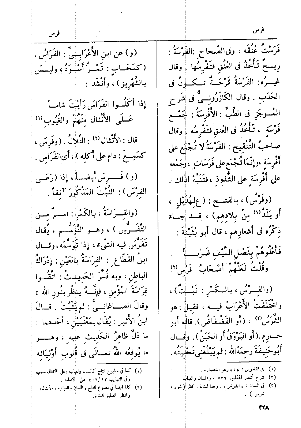 قَالَ: الأَنْثال: التِّلالُ. وفَرِسَ، كسَمِعَ: دَامَ على أَكلِه، أَي الفَرَاسِ. وفَرِسَ أَيضاً، إِذا رَعَى الفِرْسَ: النَّبْتَ المَذْكورَ آنِفاً. والفِرَاسَةُ، بالكَسْرِ: اسمٌ مِن التَّفَرُّسِ، وَهُوَ التَّوَسُّم، يُقال تَفَرَّسَ فِيهِ الشيْءَ، إِذا تَوَسَّمَه، وَقَالَ ابنُ القَطّاعِ: الفِرَاسَةُ بالعَيْنِ: إِدْرَاكُ الباطِنِ، وَبِه فُسِّرَ الحَدِيثُ: اتَّقُوا فِرَاسَةَ المُؤْمِنِ، فإِنَّه ينظُر بنُورِ الله وقالَ الصّاغَانِيُّ: لم يَثْبُتْ. قالَ ابنُ الأَثير: يُقَال بمَعْنَيَيْنِ، أَحَدهما: مَا دَلَّ ظاهِرُ الحَدِيثِ عليهِ، وَهُوَ مَا يُوقِعُه اللهُ تعالَى فِي قُلوبِ أَوْلِيَائِه