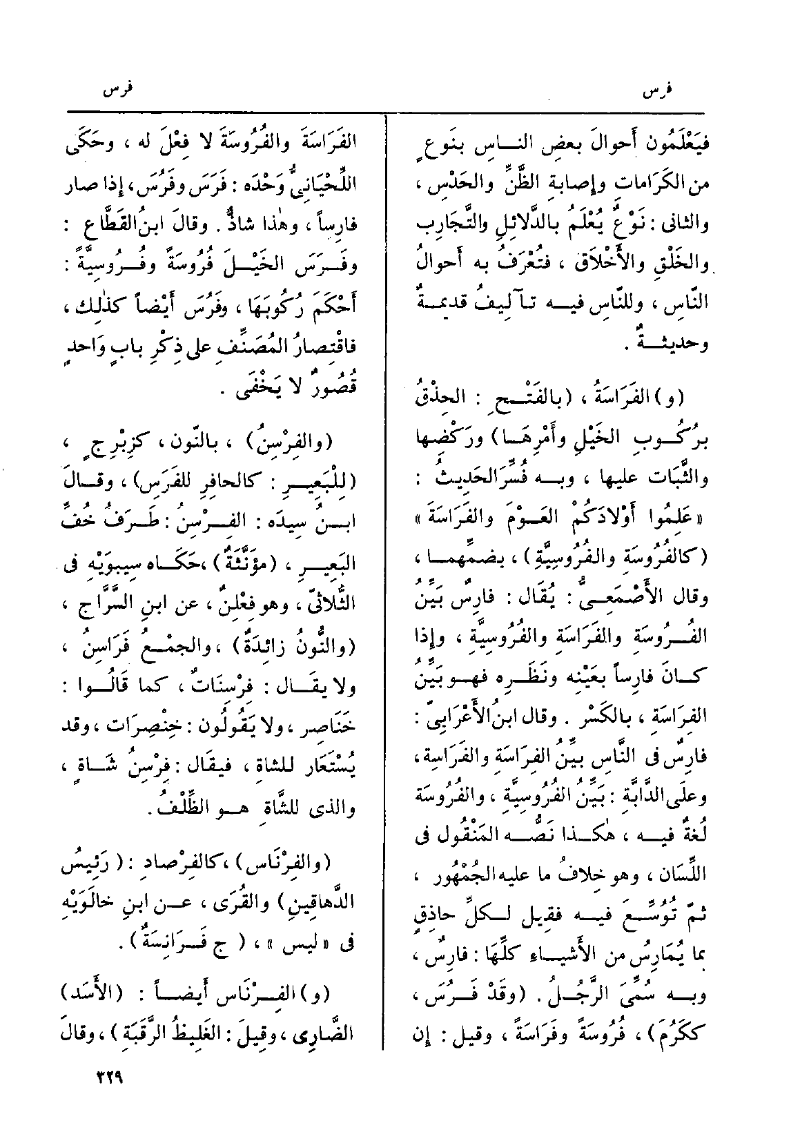 فيَعْلَمُون أَحوالَ بعضِ الناسِ بنَوعٍ من الكَرَاماتِ وإِصابةِ الظَّنِّ والحَدْسِ، وَالثَّانِي: نَوْعٌ يُعْلَمُ بالدَّلائِلِ والتَّجَارِب والخَلْقِ والأَخْلاٌ ق، فتُعْرَفُ بِهِ أَحوالُ النّاسِ، وللنّاسِ فِيهِ تآلِيفُ قديمةٌ وحديثةٌ. والفَرَاسَةُ، بالفَتْحِ: الحِذْقُ برُكُوبِ الخَيْلِ وأَمْرِهَا ورَكْضها والثَّبَات عَلَيْهَا، وَبِه فُسِّرَ الحَدِيثُ: عَلِمُوا أَوْلادَكُمْ العَوْمَ والفَرَاسَةَ كالفُرُوسَةِ والفُرُوسِيَّةِ، بضمِّهما، وَقَالَ الأَصْمَعِيُّ: يُقَال: فارِسٌ بَيِّنُ الفُرُوسَةِ والفَرَاسَةِ والفُرُوسِيَّةِ، وإِذا كانَ فارِساً بعَيْنِه نَظَرِه فَهُوَ بَيِّنُ الفِراسَةِ، بالكَسْر. وَقَالَ ابنُ الأَعْرَابِيّ: فارِسٌ فِي النَّاسِ بيِّنُ الفِرَاسَةِ والفَرَاسِة، وعلَى الدَّابَةِ: بَيِّنُ الفُرُوسِيَّةِ، والفُرُوسَة لُغةٌ فِيهِ، هَكَذَا نَصُّه المَنْقُول فِي اللِّسَان، وَهُوَ خِلافُ مَا عَلَيْهِ الجُمْهُور، ثمّ تُوُسِّعَ فِيهِ فقِيل لكلِّ حاذِقٍ بِمَا يُمَارِسُ من الأَشْياءِ كلَّهَا: فارِسٌ، وَبِه سُمِّيَ الرَّجُلُ. وقَدْ فَرُسَ، ككَرُمَ، فُرُوسَةً وفَرَاسَةً، وَقيل: إِن الفَرَاسَةَ والفُرُوسَةَ لَا فِعْلَ لَهُ، وحَكَى اللِّحْيَانِيُّ وَحْدَه: فَرَسَ وفَرُسَ، إِذا صَار فارِساً، وَهَذَا شاذٌّ. وقالَ ابنُ القَطّاع: وفَرَسَ الخِيْلَ فُرُوسَةً وفُرُوسِيَّةً: أَحْكَمَ رُكُوبَهَا، وفَرُسَ أَيْضاً كذلِك، فاقْتِصَارُ المُصَنِّفِ على ذِكْرِ بابٍ وَاحدٍ قُصُورٌ لَا يَخْفَى. والفِرْسِنُ، بالنّون، كزِبْرِجٍ، لِلْبَعِيرِ: كالحافِرِ للفرَسِ، وقالَ ابنُ سِيدَه: الفِرْسِنُ: طَرَفُ خُفِّ البَعِيرِ، مُؤَنَّثَةٌ، حَكَاه سِيبوَيْهِ فِي الثُّلاثِيّ، وَهُوَ فِعْلِنٌ، عَن ابنِ السَّرَّاج، والنُّونُ زائِدَةٌ، والجمْعُ فَرَاسِنُ، وَلَا يقَال: فِرْسِنَاتٌ، كَمَا قَالُوا: خَنَاصِر، وَلَا يَقُولُون: خِنْصَرَات، وَقد يُسْتَعارُ للشاةِ، فيقَال: فِرْسِنُ شَاةٍ، وَالَّذِي للشَّاةِ هُوَ الظِّلْفُ. والفِرْنَاس، كالفِرْصادِ: رَئِيسُ الدَّهاقِينِ والقُرَى، عَن ابنِ خالَوَيْهِ فِي لَيْسَ، ج فَرَانِسَةٌ. والفِرْنَاس أَيْضاً: الأَسَد الضَّارِي، وقِيلَ: الغَلِيظُ الرَّقَبَةِ، وقالَ: