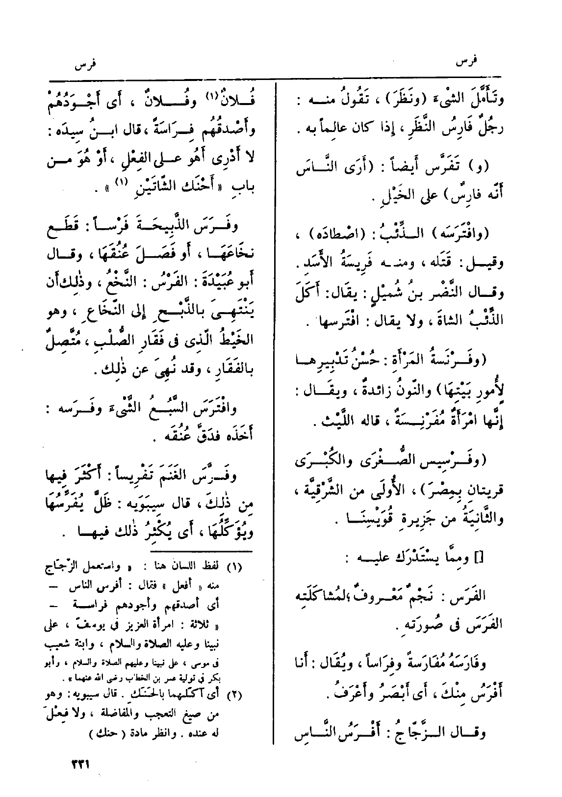 َ وتأَمَّلأَ الشيْءَ ونَظَرَ، تَقُولُ مِنْهُ: رجُلٌ فارِسُ النَّظَرِ، إِذا كَانَ عالِماً بِهِ. وتَفَرَّس أَيضاً: أَرَى النَّاسَ أَنّه فارِسٌ على الخَيْلِ. وافْتَرَسَه الذِّئبُ: اصْطادَه، وَقيل: قَتَله، وَمِنْه فَرِيسَةُ الأَسَدِ. وَقَالَ النَّضْر بنُ شُميْلٍ: يقَال: أَكَلَ الذِّئْبُ الشاةَ، وَلَا يُقَال: افْتَرَسها. وفَرْنَسةُ المَرْأَةِ: حُسْنُ تَدْبيرِها لأُمورِ بَيْتِهَا والنَّونُ زائِدةٌ، ويقَال: إِنَّها امْرَأَةٌ مُفَرْنِسَةٌ، قَالَه اللَّيْث.