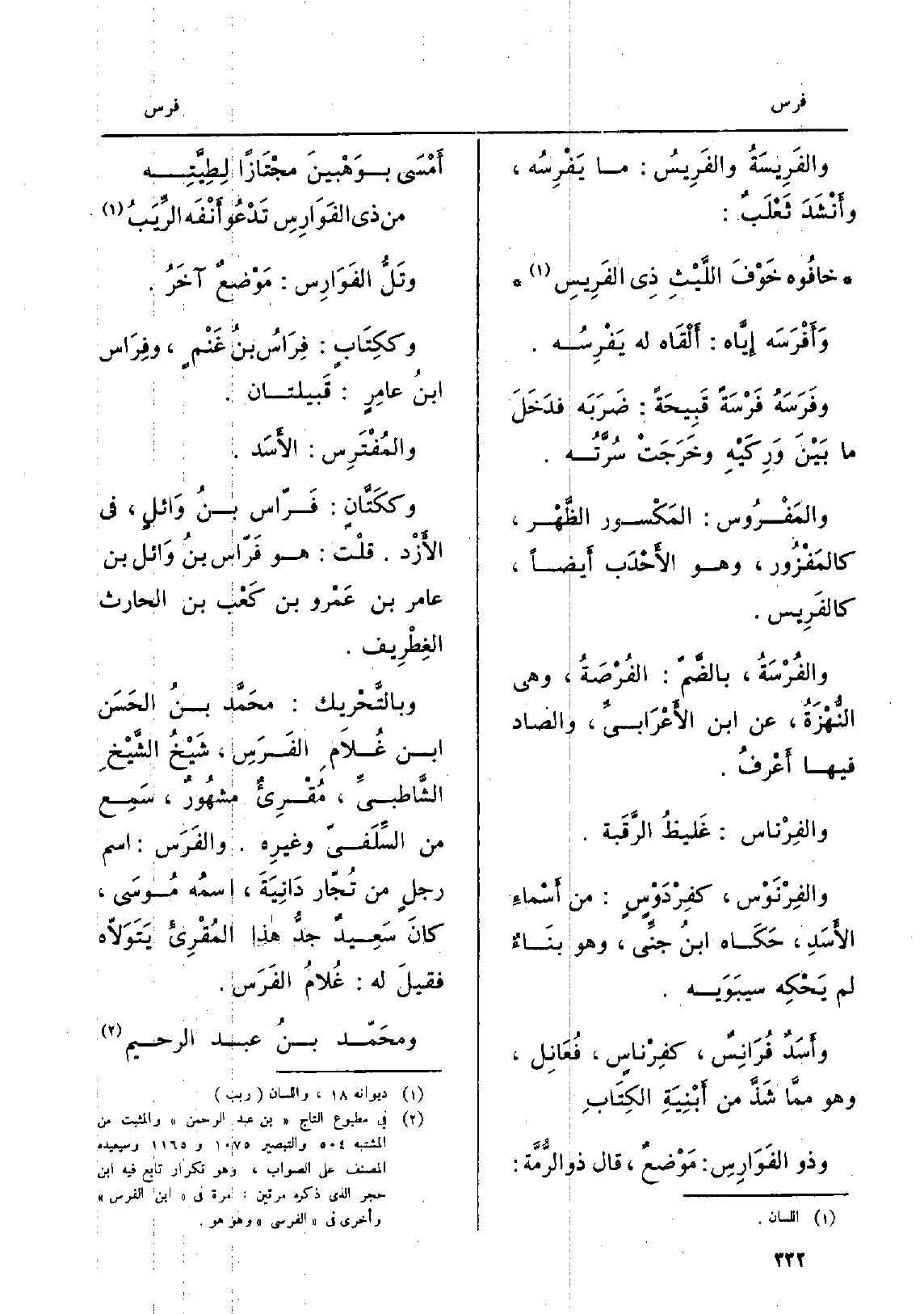 وتَلُّ الفَوَارِس: مَوْضعٌ آخَرُ. وككِتَابٍ: فِرَاسُ بنُ غَنْمٍ، وفِرَاس ابنُ عامِرٍ: قَبِيلتان. والمفْتَرِس: الأَسَد. وككَتَّانٍ: فَرّاس بنُ وَائلٍ، فِي الأَزْد. قلْت: هُوَ فَرّاس بنُ وَائِل بن عَامر بن عَمْرو بن كَعْب بن الْحَارِث الغِطْرِيف. وبالتَّحْرِيك: محَمَّد بنُ الحَسَن ابْن غُلاَمِ الفَرَسِ، شَيْخُ الشَّيْخِ الشَّاطبيِّ، مُقْرئٌ مشهُورٌ، سَمِع من السِّلَفيّ وغيرِه. والفَرَس: اسْم رجلٍ من تُجّار دَانِيَةَ، اسمُه مُوسَى، كانَ سَعِيدٌ جدُّ هَذَا المُقْرِئِ يَتَوَلاّه فقيلَ لَهُ: غُلامُ الفَرَس. ومُحَمَّد بنُ عبد الرَّحِيم