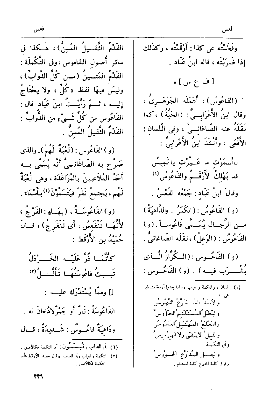 وقالَ ابنُ عَبّادٍ: جَمْعُه الفُعْسُ. والفاعُوسُ: الكَمَرُ. والدَّاهِيَةُ من الرِّجال يُِسَمَّى فَاعُوس. والفَاعُوسُ: الوَعِلُ، نقَلَه الصّاغَانِيُّ. والفَاعُوس: الكُرَّازُ الَّذِي يُشْرَب فِيهِ. والفَاعُوس: الفَدْمُ الثَّقِيلُ المُسٍ نُّ، هَكَذَا فِي سَائِر أُصولِ الْقَامُوس، وَفِي التَّكْملة: الفَدْمُ المَتِينُ من كُلِّ الدّوابِ، وليسَ فيهَا لفظ كُلِّ وَلَا يحْتَاجُ إِلَيْهِ، ثمّ رأَيْتُ ابنَ عَبّادٍ قَالَ: الفَاعُوس من كُلِّ شَيْءٍ من الدَّوابِّ: الفَدْمُ الثَّقِيلُ المُسِنُّ. والفَاعُوس: لُعْبَةٌ لَهُمْ والَّذِي صَرَّح بِهِ الصّاغَانِيُّ أَنَّه يُسَمَّى بِهِ أَحَدُ الملاَعِبينَ بالمُواغَدَة، وَهِي لُعْبَةٌ لَهُم، يَجْتمعُ نَفَرٌ فَيَتَسَمَّوْنَ بأَسْمَاءَ. والفَاعُوسَةُ، بَهَاءٍ: الفَرْجُ، لأَنَّها تَنْفَعِسُ، أَي تَنْفَرِجُ، قالَ حُمَيْدُ بن الأَرْقَط: