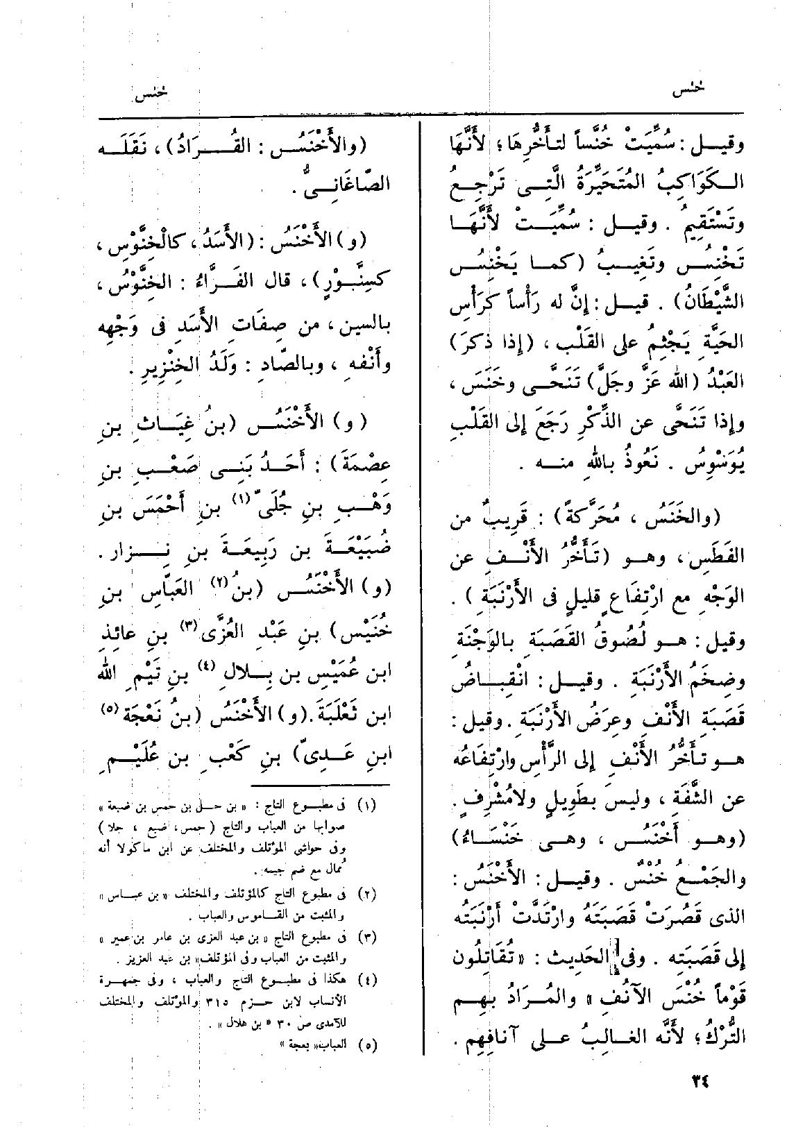 وَقيل: سُمِّيّتْ خُنَّساً لتأَخُّرِها لأَنَّهَا الكَوَاكِبُ المُتَحَيِّرَةُ الَّتِي تَرْجِعُ وتَسْتَقِيمُ. وَقيل: سُمِّيَتْ لأَنَّهَا تَخْنِسُ وتَغِيبَ كَمَا يَخْنِسُ الشَّيْطَانُ. قيل: إِنَّ لَهُ رَأْساً كرَأْسِ الحَيَّةِ يَجْثِمُ على القَلْب، إِذا ذكرَ العَبْدُ الله عَزَّ وجَلَّ تَنَحَّى وخَنَسَ، وإِذا تَنَحَّى عَن الذِّكْرِ رَجَعَ إِلَى القَلْبِ يُوَسْوِسُ. نَعُوذُ باللهِ مِنْهُ.
