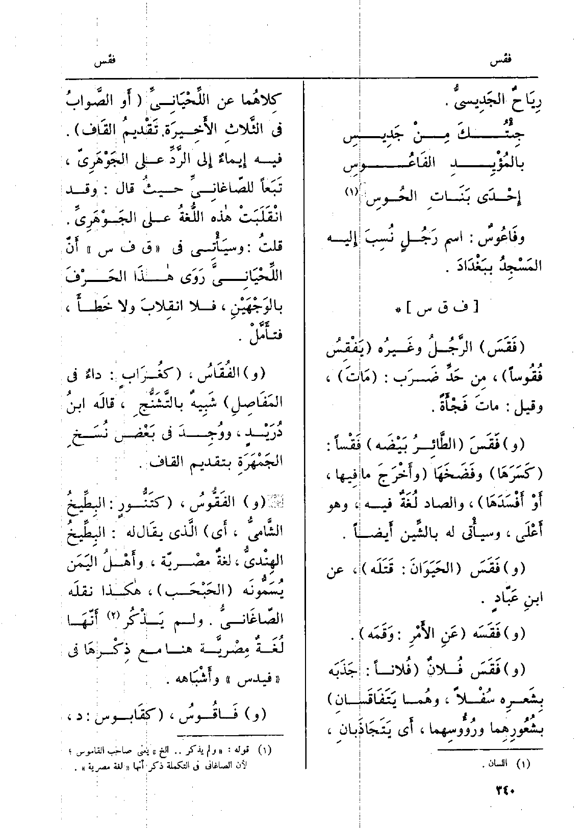 فَقَسَ الرَّجُلُ وغَيْرُه يَفْقِسُ فُقُوساً، مِن حَدِّ ضرب: ماتَ، وَقيل: ماتَ فَجْأَةً. وفَقَسَ الطَّائِرُ بَيْضَه فَقْساً: كَسَرَهَا وفَضَخَهَا وأَخْرَجَ مَا فِيها، أَو أفْسَدَها، وَالصَّاد لُغَةٌ فِيهِ، وَهُوَ أَعْلَى، وسيأْتِي لَهُ بالشّين أَيضاً. وفَقَسَ الحَيَوَانَ: قَتَلَه، عَن ابنِ عَبّادٍ. وفَقَسَه عَنِ الأَمْرِ: وَقَمَه. وفَقَسَ فُلانٌ فُلاناً: جَذَبَه بِشَعِرِه سُفلاً، وهُما يَتَفَاقَسانِ بشُعُورِهِما، ورُؤُوسِهما، أَي يَتَجَاذَبانِ، كِلاهُما عَن اللِّحْيَانِيِّ أَو الصَّوابُ فِي الثَّلاثِ الأخِيرَة تَقْدِيم القَاف. فِيهِ إِيماءٌ إِلى الرَّدِّ على الجَوْهَرِيّ، تَبَعاً للصّاغانِيِّ حيثُ قَالَ: وَقد انْقَلَبَتْ هَذِه اللُّغَةُ على الجَوْهَرِيِّ. قلتُ: وسيأْتِي فِي ق ف س أَنّ اللِّحْيَانِيَّ رَوَى هذَا الحَرْفَ بالوَجْهَيْنِ، فَلَا انقِلابَ وَلَا خَطأَ، فتأَمَّلْ. والفُقَاسُ، كغُرَابٍ: داءٌ فِي المَفَاصِلِ شَبِيهٌ بالتَّشَنَّجِ، قالَه ابنُ دُرَيْدٍ، ووُجِدَ فِي بَعْضِ نُسَخِ الجَمْهَرَةِ بِتَقْدِيم الْقَاف. والفَقُّسُ، كتَنُّورٍ: البِطِّيخُ الشّاميُّ، أَي الَّذِي يقَال لَهُ: البِطِّيخُ الهِنْدِيُّ، لغةٌ مصْريّة، وأَهْلُ اليَمَن يُسَمُّونَه الحَبحَب، هَكَذَا نقلَه الصّاغَانِيُّ. وَلم يَذْكُر أَنّهَا لغَةٌ مِصْريَّة هُنَا مَعَ ذِكْرَها فِي فيدس وأَشْبَاهه. وفَاقُوسُ، كقابوس: د،