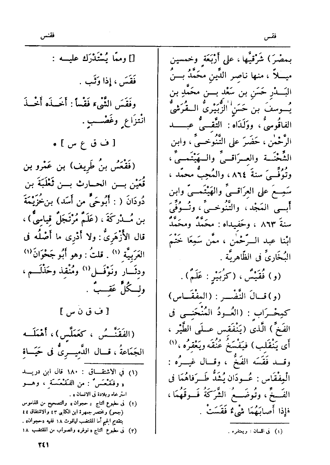 بمصْرَ شَرْقيَّها، على أَرْبَعَةٍ وَخمسين ميلًا، مِنْهَا منْهَا ناصِر الدِّينِ محَمَّدُ بنُ البَدْرِ حَسَنِ بن سَعْد بن محَمَّدُ بنُ البَدْرِ حَسَنِ بن سَعْد بن محَمَّدِ بن يُوسفَ بن حَسَنٍ الزُّبَيْريُّ القُرَشيُّ الفاقُوسيُّ، ووَلَدَاه: التَّقِيُّ عبد الرَّحْمن، حَضَرَ على التَّنُوخيِّ، وَابْن الشِّحْنَة والعِرَاقِيِّ والهَيْتَميِّ، وتُوُفِّيَ سنةَ، والمُحِبُّ محمَّد، سَمِعَ على العِرَاقِيِّ والهَيْتَميِّ وَابْن أَبي المَجْد، والتَّنُوخيِّ، وتُوُفِّيَ سنة، وحَفِيداه محَمَّدٌ ومحَمَّدٌ ابْنا عبد الرّحمن، ممَّن سَمِعَا خَتْمَ البُخَاريِّ فِي الظّاهريَّة. وفُقَيْسٌ، كزُبَيْرٍ: عَلَمٌ. وقالَ النَّضْر: المِفْقَاس كمِحْرَابٍ: العُودُ المُنْحَنِي فِي الفَخِّ الَّذي يَنْفَقَس على الطَّيْر، أَي يَنْقَلِب فيَفْسَخُ عُنُقَه ويَعْقِرُه. وَقد فَقَسَه الفَخُّ، وَقَالَ غيرُه: الْمِفْقَاس: عُودَان يُشَدُّ طَرَفاهُمَا فِي الفَخِّ، وتُوضَعُ الشَّرَكَةُ فِوقَهُمَا، فإِذا أَصابَهُمَا شيءٌ فَقَسَتْ. وممَّا يُسْتَدْرَكُ عَلَيْهِ: فَقَسَ، إِذا وَثَبَ. وفَقَسَ الشَّيْءَ فَقْساً: أَخَذَه أَخْذَ انْتزَاعٍ وغَصْبٍ.