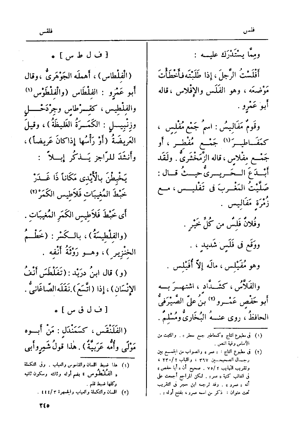 الْفِلْطاس، أَهمَلَه الجَوْهَرِيُّ، وَقَالَ أَبو عَمْرٍ و: الفِلْطَاس والْفِلْطَوْس والفِلْطِيس، كقِرْطاسٍ وجِرْدَحْلٍ وزِنْبِيلٍ: الكَمَرَةُ الغَليظَةُ، وقيلَ العَريضَةُ أوْ رَأْسُها إِذا كانَ عَريضاً، وأَنشَدَ للرّاجز يَذكُر إِبلاً: