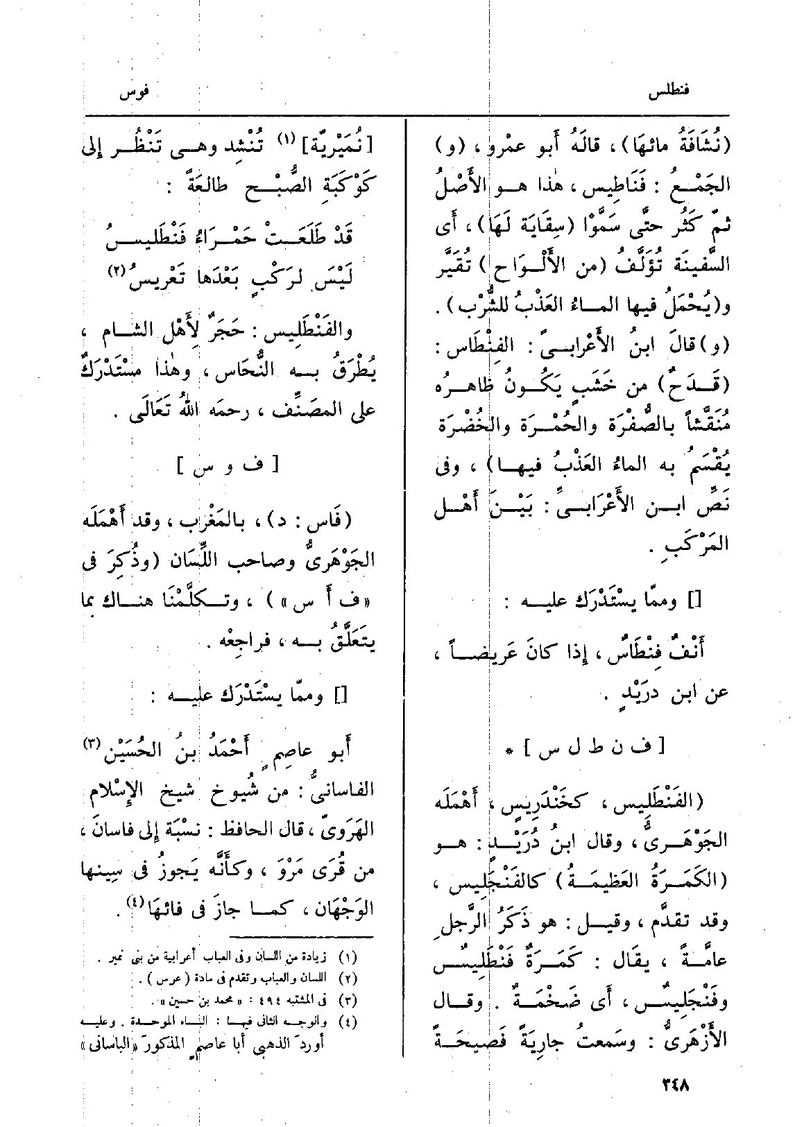 {فَاس: د، بالمَغْرب، وَقد أَهْمَلَه الجَوْهَرِيُّ وَصَاحب اللِّسَان وذُكِرَ فِي ف أس، وتكلَّمْنَا هُنَاكَ بِمَا يتَعَلَّقُ بِهِ، فراجِعْه. وممّا يسْتَدْرَك عَلَيْهِ: أَبو عاصِمٍ أَحْمَدُ بنُ الحُسَيْن} - الفاسانيُّ: من شُيُوخ شيخ الإِسْلامِ الهَرَوِيّ، قَالَ الْحَافِظ: نسْبَة إِلَى! فاسانَ، من قُرَى مَرْوَ، وكأَنَّه يَجوزُ فِي سِينها الوَجْهَان، كَمَا جازَ فِي فائها.