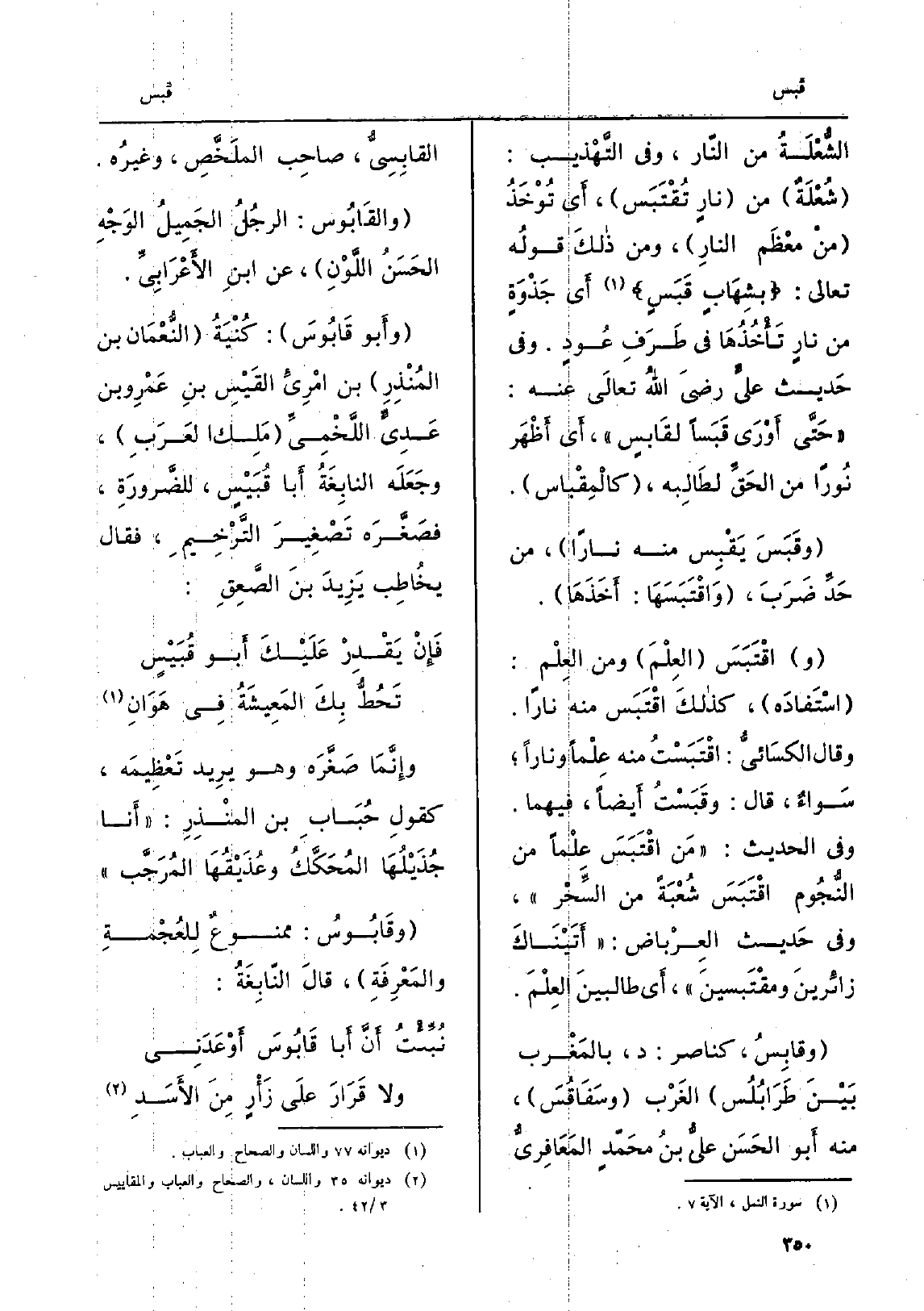 الشُّعْلَةُ من النّار، وَفِي التَّهْذِيب: شُعْلَةٌ من نارٍ تُقْتَبَس، أَي تُوْخَذُ منْ مُعْظَم النارِ، وَمن ذلكَ قولُه تَعَالَى: بشِهَابٍ قَبَسٍ أَي جَذْوَةٍ من نارٍ تَأْخُذُهَا فِي طَرَفِ عُودٍ. وَفِي حَديث عليٍّ رضيَ اللهُ تعالَى عَنهُ: حَتَّى أَوْرَى قَبَساً لقَابسٍ، أَي أَظْهَر نُوراً من الحَقِِّ لطَالِبه، كالمِقْباس. وقَبَسَ يَقْبِس مِنْهُ نَارا، من حَدِّ ضَرَبَ، واقْتَبَسَهَا: أَخَذَهَا. واقْتَبَسَ العِلْمَ وَمن العِلْم: اسْتَفادَه، كذلكَ اقْتَبَسَ مِنْهُ نَارا. وَقَالَ الكسَائيُّ: اقْتَبَسْتُ مِنْهُ عِلْماً وَنَارًا، سَواءٌ، قَالَ: وقَبَستُ أَيضاً، فيهمَا. وَفِي الحَدِيث: من اقْتَبَسَ عِلْماً من النَّجُوم اقْتَبَسَ شُعْبَةً من السِّحْر، وَفِي حَديث العِرْباض: أَتَيْنَاكَ زائِرينَ ومقْتَبسينَ، أَي طالبينَ العِلْمَ. وقاَبِسُ، كناصر: د، بالمَغْرب بَيْنَ طَرَابُلُس الغَرْب وسَفَاقُسَ، مِنْهُ أبُو الحَسَن عليُّ بنُ محَمَّدٍ المَعَافِريُّ القابِسِيُّ، صاحِب الملَخَّصِ، وغيرهُ. والقابُوس: الرجُلُ الجَمِيلُ الوَجْهِ الحَسَنُ اللَّوْنِ، عَن ابنِ الأَعْرَابِيِّ. وأَبو قَابُوسَ: كُنْيَةُ النُّعْمَان بن المُنْذِرِ بن امْرِئِ القَيْسِ بنِ عَمْرِ وبن عَدِيٍّ اللَّخْمِيِّ مَلِك العَرَبِ، وجَعَلَه النابِغَةُ أَبا قُبَيْسٍ، للضَّرورَةِ، فَصَغَّرَه تَصْغِيرَ التَّرْخِيمِ، فَقَالَ يخاطِب يَزِيدَ بنَ الصَّعِقِ: