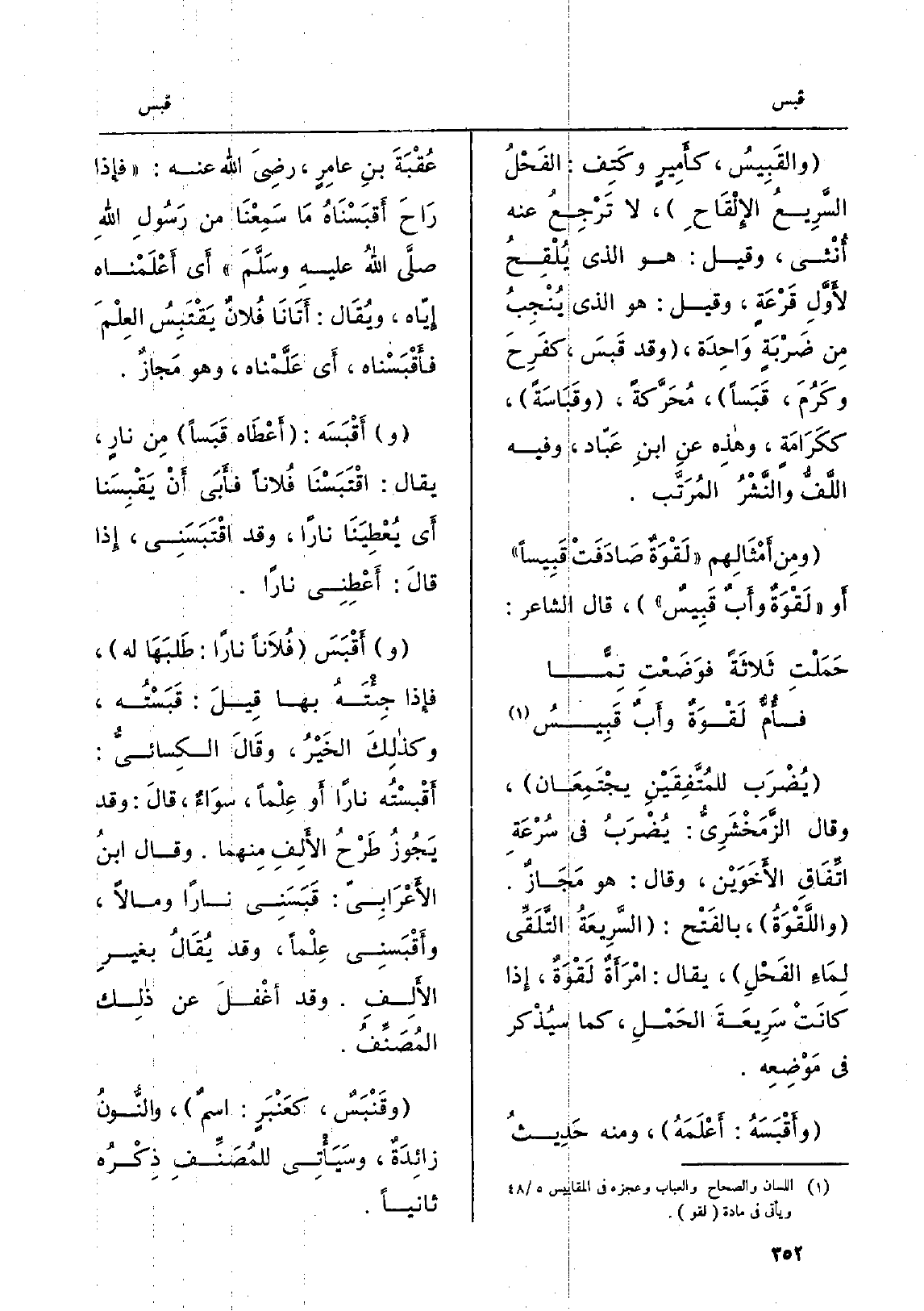 العِلْمَ فأَقْبَسْناه، أَي عَلَّمْناه، وَهُوَ مَجازٌ. وأَقْبَسَه: أَعْطاه قَبساً مِن نارٍ، يُقَال: اقْتَبَسْنا فُلاناً فأَبَى أَنْ يَقْبِسَنا أَي يُعْطِيَنَا نَارا، وَقد اقْتَبَسَنِي، إِذا قالَ: أَعْطِنِي نَارا. وأَقْبَسَ فُلاَناً: طَلَبَهَا لَهُ، فإِذا جِئْتَهُ بهَا قِيلَ: قَبَسْتُه، وكذلِكَ الخَيْرُ، وقالَ الكِسائيُّ: أَقْبسْتُه نَارا أَو عِلْماً، سوَاءٌ، قالَ: وَقد يَجُوزُ طَرْحُ الأَلِفِ مِنهما. وقالَ ابنُ الأَعْرَابِيّ: قَبَسَنِي نَارا ومالاً، وأَقْبَسنِي عِلْماً، وَقد يُقَالُ بغيرِ الأَلِفِ. وَقد أغْفلَ عَن ذلِك المُصَنِّفُ. وقَنْبَسٌ، كعَنْبَرٍ: اسمٌ، والنُّونُ زائِدَةٌ، وسَيَأْتِي للمُصَنِّفِ ذِكْرُه ثانِياً.