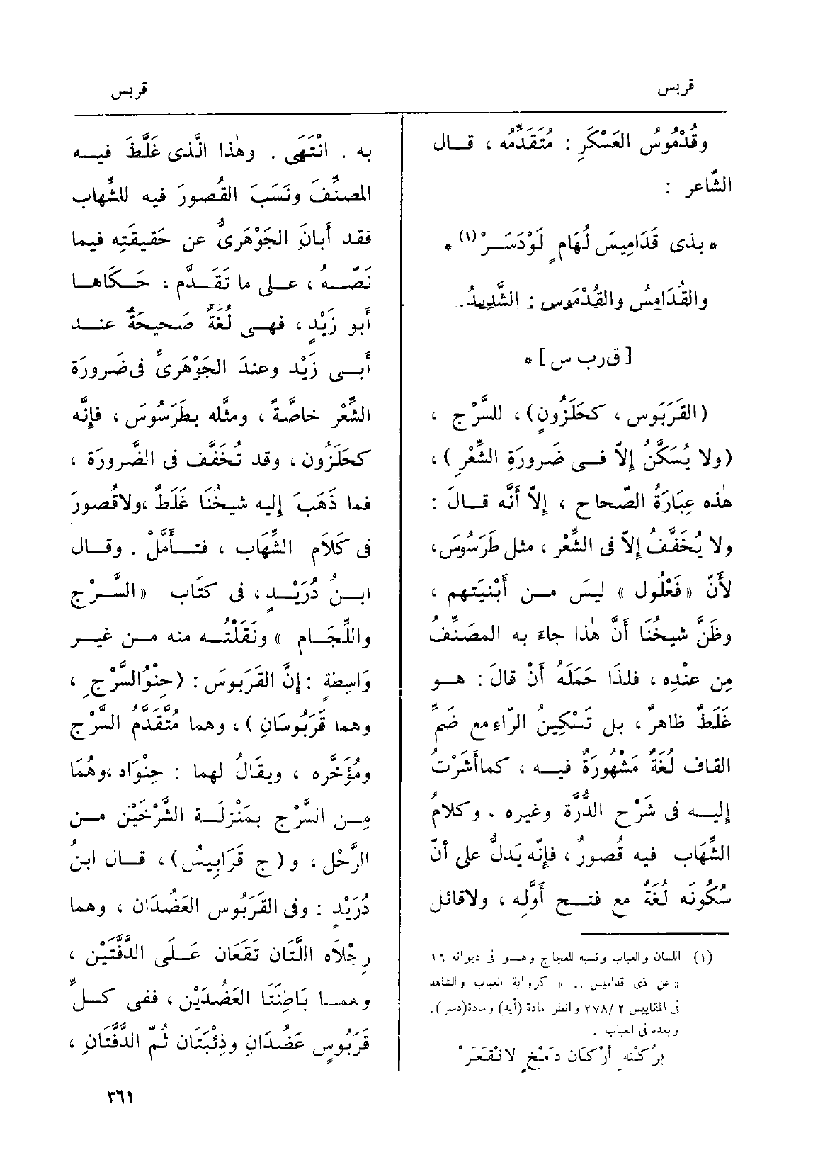 القَرَبَوس، كحَلَزُونٍ، للسَّرْج، وَلَا يُسَكَّنُ إِلاّ فِي ضَرورَةِ الشِّعْرِ، هَذِه عَبَارَةُ الصّحاح، إِلا أَنَّه قالَ: وَلَا يَخَفَّفُ إِلاّ فِي الشِّعْر، مثل طَرَسُوسَ، لأَنّ فَعْلُول ليسَ من أَبْنيَتهم، وظَنَّ شيخُنَا أَنَّ هَذَا جاءَ بِهِ المصَنِّفُ مِن عنْدِه، فلذَا حَمَلَهُ أَنْ قالَ: هُوَ غَلَطٌ ظاهرٌ، بل تَسْكِينُ الرّاءِ مَعَ ضَمِّ الْقَاف لُغَةٌ مَشْهُورَةٌ فِيهِ، كَمَا أَشَرْتُ إِليه فِي شَرْح الدُّرة وَغَيره، وكلامُ الشِّهَاب فِيهِ قُصورٌ، فإِنّه يَدلُّ على أَنّ سُكُونَه لُغَةٌ مَعَ فتح أَوَّلِه، وَلَا قَائِل بِهِ. إنْتَهَى. وَهَذَا الَّذي غَلَّطَ فِيهِ المصنِّفَ ونَسَبَ القُصورَ فِيهِ للشِّهاب فقد أَبانَ الجَوْهَرِيُّ عَن حَقيقَتِه فِيمَا نَصّهُ، على مَا تَقَدَّم، حَكَاها أَبو زَيْدٍ، فَهِيَ لُغَةٌ صَحيحةٌ عِنْد أَبي زَيْد وعندَ الجَوْهَرِيِّ فِي ضَرورَة الشِّعْر خاصَّةً، ومثَّله بطَرَسُوسَ، فإِنَّه كحَلَزُون، وَقد تُخَفَّف فِي الضَّرورَة، فَمَا ذَهَبَ إِليه شيخُنَا غَلَطٌ، وَلَا قُصورَ فِي كَلام الشِّهَاب، فتأَمَّلْ، وَقَالَ ابنُ دُرَيْدٍ، فِي كتَاب السَّرْج واللِّجَام ونَقَلْتُه مِنْهُ من غير وَاسِطةٍ: إِنَّ القَرَبوسَ: حِنْوُ السَّرْجِ، وهما قَرَبُوسَانِ، وهما مُتَّقَدَّمُ السَّرْجِ ومُؤَخَّره، ويقَالُ لَهما: حِنْوَاه، وهَمَا مِن السَّرْج بمَنْزلَة الشَّرْخَيْن من الرَّحْل، وَج قَرَابِيسُ، قَالَ ابنُ دُرَيْدٍ: وَفِي القَرَبُوس العَضُدَان، وهما رِجْلاَه اللَّتَان تَقَعَان عَلَى الدَّفَّتَيْن، وهما بَاطِنَتَا العَضُدَيْن، فَفِي كلِّ قَرَبُوسٍ عَضُدَانِ وذِئْبَتَان ثُمّ الدَّفَّتَانِ،