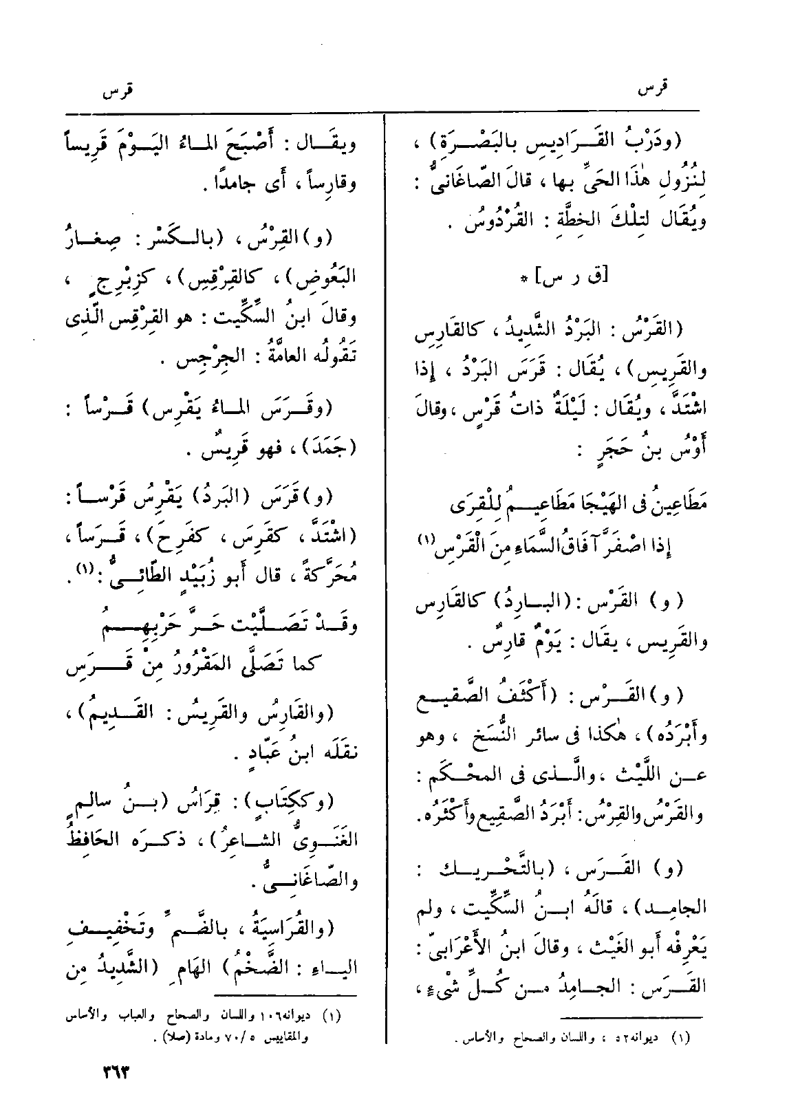 والقَرَس، بالتَّحْريك: الجامدِ، قالَهُ ابنُ السِّكِّيت، وَلم يَعْرِفْه أَبو الغَيْث، وَقَالَ ابنُ الأَعْرَابِيّ: القَرَس: الجَامِدُ من كُلِّ شْيءٍ، ويقَال: أَصْبَحَ الماءُ اليَوْمَ قَرِيساً وقارِساً، أَي جَامِدا. والقِرْسُ، بالكَسْر: صِغارُ البَعُوضِ، كالقِرْقِسِ، كزِبْرِجٍ، وقالَ ابنُ السِّكِّيت: هُوَ القِرْقِس الّذِي تَقُولُه العامَّةُ: الجِرْجِس. وقَرَسَ الماءُ يَقْرِس قَرْساً: جَمَدَ، فَهُوَ قَرِيسٌ. وقَرَسَ البَردُ يُقْرِسُ قَرْساً: إشْتَدَّ، كقَرِسَ، كفَرِحَ، قَرسَاً، مُحَرَّكةً، قَالَ أَبو زُبَيْدٍ الطّائِيُّ: