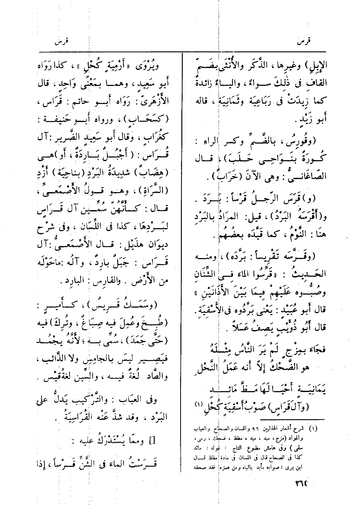 ويُرْوَى أَرْمِيَةٍ كُحْلٍ، كَذَا رَوَاه أَبو سَعِيدٍ، وهما بمَعْنىً وَاحِدٍ، قَالَ الأَزْهَريّ: رَوَاه أَبو حَاتِم: قَرَاس، كسَحَابٍ، وَرَوَاهُ أَبو حَنيفة: كغُرَابٍ، وَقَالَ أَبو سَعِيدٍ الضَّرير: آل قُرَاس: أَجْبُلٌ بَارِدَةٌ، أَو هِيَ هِضَابٌ شدِيدَةُ البَرْدِ بناحِيَة أَزْدِ السَّرَاةِ، وَهُوَ قولُ الأَصْمَعيِّ، قَالَ: كأَنَّهُنّ سُمِّين آل قَرَاسٍ لبَرْدِهَا، كَذَا فِي اللِّسَان، وَفِي شرْح ديوَان هذَيْل: قَالَ الأَصْمَعيُّ: آل قَرَاس: جَبَلٌ بارِدٌ، وآلُه: مَا حَوْلَه من الأَرْض. والقارِس: البارِد. وسَمَكُ قَريسٌ، كأَميرٍ: طُبِخَ عُمِلَ فِيهِ صِبَاغٌ، وتُرِكَ فِيهِ حَتَّى جَمَدَ، سُمِّيَ بِهِ لأَنَّهُ يجْمُد فيَصِير ليسَ بالجامِسِ وَلَا الذَّائب، والصَّاد لُغةٌ فِيهِ، والسِّين لغةُ قيْس. وَفِي العبَاب: والتَّركيب يَدلُّ على البَرْد، وَقد شذَّ عَنْه القُرَاسِيَةُ. وممّا يُسْتَدْرَكُ عَلَيْهِ: قَرَسْتُ الماءَ فِي الشَّنِّ قَرْساً، إِذا