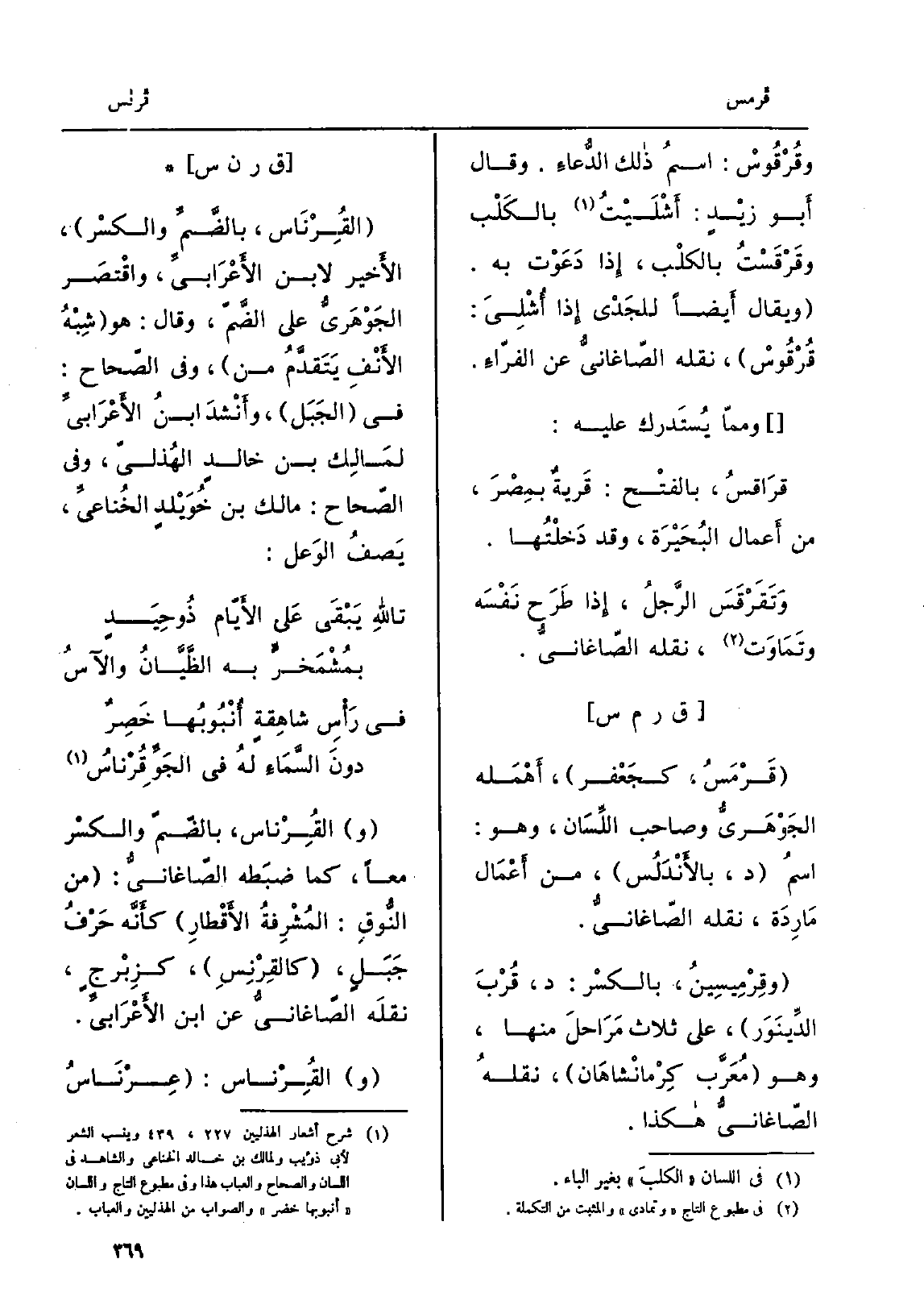 القُرنْاس، بالضَّمِّ، والكسْر، الأَخير لِابْنِ الأَعْرَابيِّ، وإقْتصَر الجَوْهَريُّ على الضَّمّ، وَقَالَ: هُوَ شِبُهُ الأَنْفِ يَتَقدَّمُ من، وَفِي الصّحاح: فِي الجَبَل، وأَنْشدَ ابنُ الأَعْرَابيِّ لمَالِك بن خالدٍ الهُذليّ، وَفِي الصّحاح: مَالك بن خُوَيْلدٍ الخُناعيِّ، يَصفُ الوَعل: