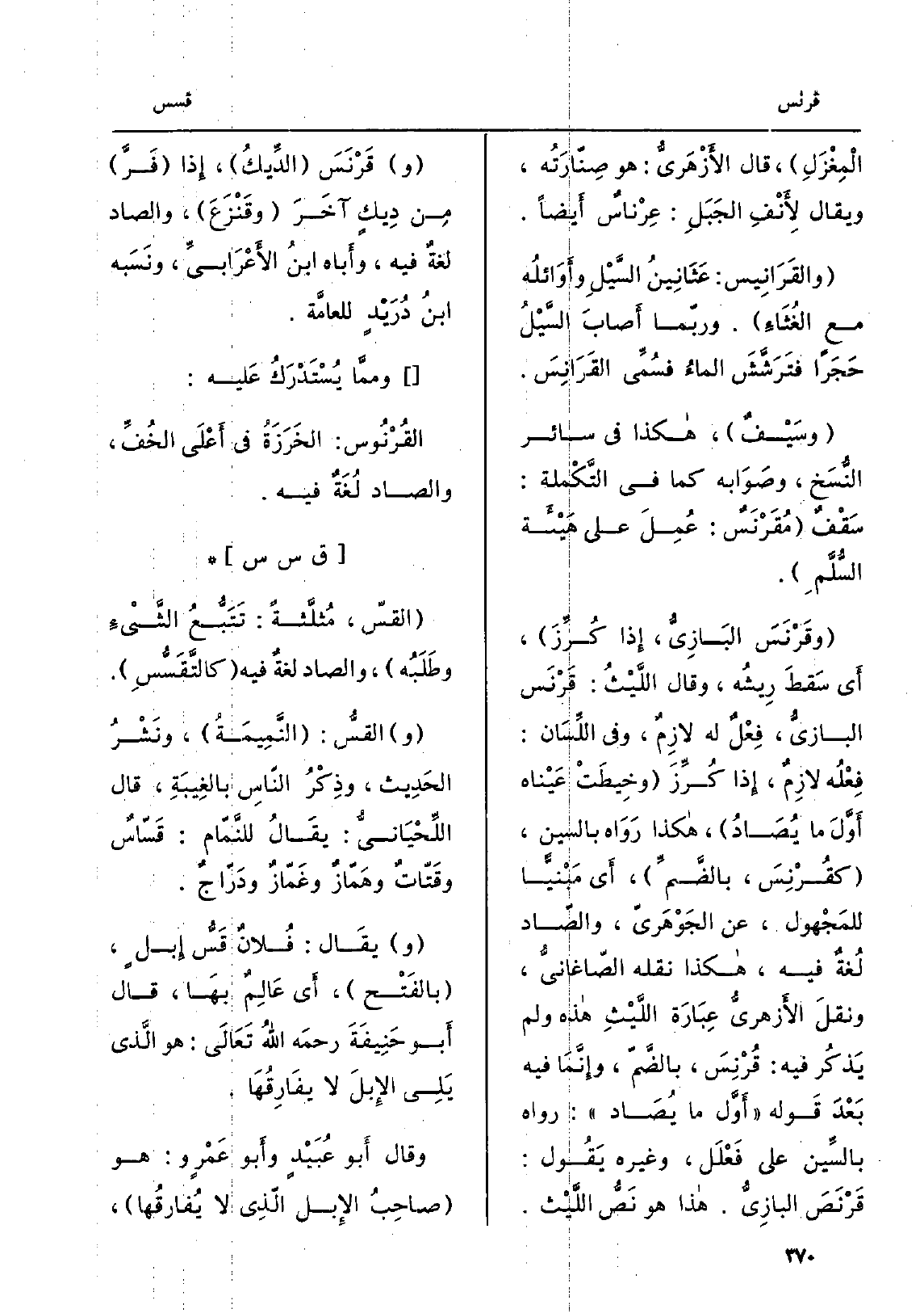 الْمِغْزَلِ، قَالَ الأَزْهَريُّ: هُوَ صِنّارَتُه، وَيُقَال لأَنْفِ الجَبَلِ: عِرْناسٌ أَيضاً. والقَرَانيس: عَثَانِينُ السَّيْلِ وأَوَائلُه مَعَ الغُثَاءِ. وربّما أَصابَ السَّيْلُ حَجَراً فتَرَشَّشَ الماءُ فسُمَّي القَرَانِسَ. وسَيْفٌ، هَكَذَا فِي سَائِر النُّسَخ، وصَوَابه كَمَا فِي التَّكْملة: سَقَفٌ مُقْرْنَسٌ: عُمَلَ على هَيْئَة السُّلَّمِ. وقَرْنَسَ البَازِيُّ، إِذا كُرِّزَ، أَي سَقطَ رِيشُه، وَقَالَ اللَّيْثُ: قَرْنَس البازيُّ، فِعْلٌ لَهُ لازِمٌ، وَفِي اللِّسَان: فِعُلُه لازِمٌ، إِذا كُرِّزَ وخِيطَتْ عَيْناه أَوَّلَ مَا يُصَادُ، هَكَذَا رَوَاه بِالسِّين، كقُرْنِسَ، بالضَّمِّ، أَي مَبْنيّاً للمَجْهول، عَن الجَوْهَريّ، والصّاد لُغةٌ فِيهِ، هَكَذَا نَقله الصّاغانيُّ، ونقلَ الأَزهريُّ عِبَارَة اللَّيْثِ هَذِه وَلم يَذكُر فِيهِ: قَرْنِسَ، بالضَّمّ، وإِنَّمَا فِيهِ بَعْدَ قَوله أوَّل مَا يُصَاد: رَوَاهُ بالسِّين على فَعْلَل، وَغَيره يَقُول: قَرْنَصَ البازِيُّ. هَذَا هُوَ نَص اللَّيْث. وقَرْنَسَ الدِّيكُ، إِذا فَرَّ مِن دِيكٍ آخَرَ وقَنْزَعَ، وَالصَّاد لغةٌ فِيهِ، وأَباه ابنُ الأَعْرَابيِّ، ونَسَبه ابنُ دُرَيْدٍ للعامَّة. وممَّا يُسْتَدْرَكُ عَليه: القُرْنُوس: الخَرَزَةُ فِي أَعْلَى الخُفِّ، وَالصَّاد لُغَةٌ فِيهِ.