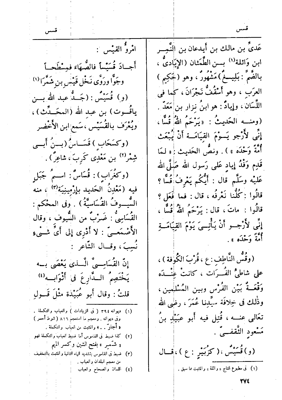 عَديِّ بن مَالك بن أَيدعان بن النَّمِر ابْن وَائلة بن الطَّمَثان الإِيَاديُّ، بالضَّمِّ: بَلِيغٌ مَشْهُورٌ، وَهُوَ حَكِيم العرَبِ، وَهُوَ أَسْقُفُّ نَجْرَانَ، كَمَا فِي اللِّسَان، وإِيادٌ: هُوَ ابنُ نِزار بن مَعَدّ. وَمِنْه الحَديثُ: يَرْحَمُ اللهُ {قُسّاً، إِنِّي لأَرْجو يَوْمَ القِيَامَة أَنْ يُبْعَث أُمَّةً وَحْدَه. ونصُّ الحَديث: لمَا قَدِم وَفْدُ إِيادٍ عَلى رَسول الله صَلَّى الله عَليْه وسَلَّم قَالَ: أَيُّكُم يَعْرِفُ قُسّاً قالُوا: كُلُّنا نَعْرفُه، قَالَ: فَمَا فَعَل قالُوا: ماتَ، قَالَ: يَرْحَمُ اللهُ قُسّاً، إِنِّي لأَرْجُو أَنْ يَأْتِيَ يَوْمَ القِيَامَةِ أُمَّةً وَحْدَه. وقُسُّ النَّاطِفِ: ع، قُرْبَ)