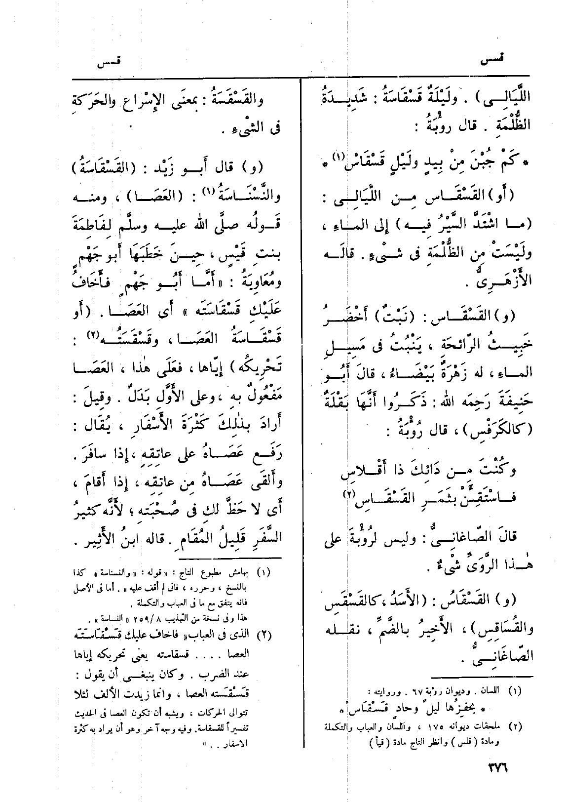 قَالَ رؤْبَةُ: كَمْ جُبْنَ مِنْ بِيدٍ ولَيْلٍ قَسْقَاسْ أَو} القَسْقَاس مِن اللَّيَالِي: مَا إشْتَدَّ السَّيْرُ فِيهِ إِلى الماءِ، ولَيْسَتْ من الظُّلْمَةِ فِي شيْءٍ. قالَه الأَزْهَرِيُّ. والقَسْقَاس: نَبْتٌ أَخْضَرُ خَبِيثُ الرّائحَةِ، يَنْبُتُ فِي مَسِيلِ الماءِ، لَهُ زَهْرَةٌ بَيْضَاءُ، قَالَ أَبُو حَنِيفَةَ رَحِمَه الله: ذَكَرُوا أَنَّهَا بَقْلَةٌ كالكَرَفْسِ، قَالَ رُؤْبَةُ: وكُنْتَ مِن دَائِكَ ذَا أَقْلاسِ فإسْتَقِئَنْ بَثَمَرِ القَسْقَاسِ قالَ الصّاغانِيُّ: وَلَيْسَ لرُؤْبَةَ على هَذَا الرَّوَيِّ شيْءٌ. والقَسْقَاسُ: الأَسَدُ، {كالقَسْقَسِ} والقُسَاقِسِ، الأَخِيرُ بالضَّمَّ، نَقله الصّاغَانِيُّ. {والقَسْقَسَةُ: بمعنَى الإِسْراع والحَرَكةِ فِي الشْيءِ. وَقَالَ أَبو زَيْد:} القَسْقَاسَةُ والنَّسْنَاسَةُ: العَصَا، وَمِنْه قَولُه صلَّى الله عَلَيْهِ وسلَّم لفَاطِمَةَ بنتِ قَيْسٍ، حينَ خَطَبَهَا أَبو جَهْمٍ ومُعَاوِيَةُ: أَمَّا أَبُو جَهْمٍ فأَخَافُ عَلَيْكِ {قَسْقَاسَتَه، أَي العَصَا. أَو} قَسْقَاسَةُ العَصَا،! وقَسْقَسَتُه: تَحْرِيكُه إِيّاها، فعَلَى هَذَا، العَصَا مَفْعُولٌ بهِ، وعَلى الأَوَّلِ بَدَلٌ. وقِيلَ: أَرادَ بذلِكَ كَثْرَةَ الأَسْفَارِ، يُقَال: رَفَع عَصَاهُ على عاتِقِهِ، إِذا سافَرَ. وأَلَقَى عَصَاهُ مِن عاتِقِه، إِذا أَقامَ، أَي لَا حَظَّ لكِ فِي صُحْبَتهِ، لأَنَّه كثيرُ السَّفَرِ قَلِيلُ المُقَامِ. قَالَه ابنُ الأَثِير.