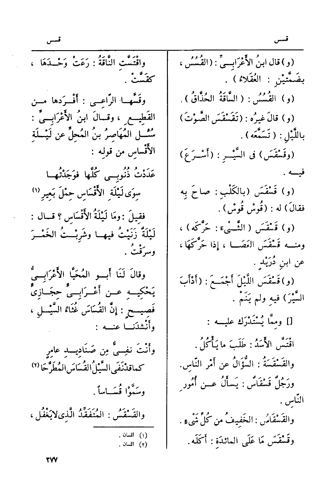 وَقَالَ ابنُ الأَعْرَابِيِّ: {القُسُسُ، بضَمَّتْينِ: العُقَلاءُ. والقُسُسُ: السَّاقَةُ الحُذَّاقُ. وقالَ غيرُه:} تَقَسْقَسَ الصَّوْتَ باللَّيْلِ: تَسَمَّعَه. {وقَسْقَسَ فِي السَّيْرِ: أَسْرَعَ فِيهِ. (و) } قَسْقَسَ بالكَلْبِ: صاحَ بِه فقالَ لَهُ: {قُوسْ} قُوسْ. (و) {قَسْقَسَ الشَّيْءَ: حَرَّكَه، وَمِنْه قَسْقَسَ العَصَا، إِذا حَرَّكَهَا، عَن ابنِ دُرَيْدٍ. وقَسْقَسَ اللَّيْلَ أَجْمَعَ: أَدْأَبَ السَّيْرَ فيهِ وَلم يَنَمْ.