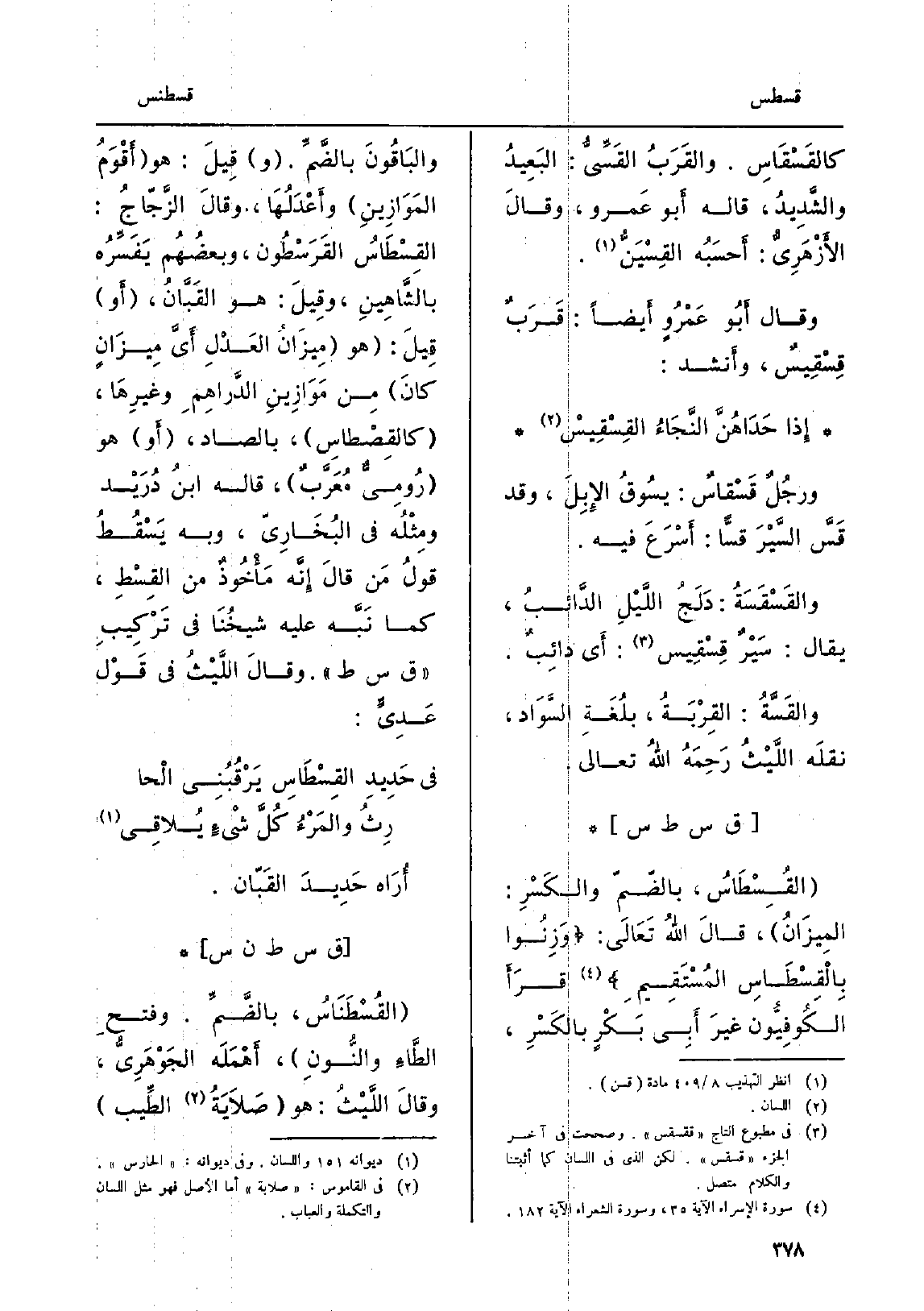 {القُسْطَاسُ، بالضّمّ والكَسْرِ: المِيزَانُ، قَالَ اللهُ تَعَالَى: وَزِنُوا} بِالْقِسْطَاسِ المُسْتَقِيمِ قرَأَ الكُوفِيُّون غيرَ أَبي بَكْرٍ بالكَسْرِ، والبَاقُونَ بالضَّمِّ. وقِيلَ: هُوَ أَقْوَمُ المَوَازِينِ وأَعْدَلُهَا، وقالَ الزَّجّاجُ: القِسْطَاسُ القَرَسْطُون، وبعضُهُم يَفَسِّرُه بالشَّاهِينِ، وقِيلَ: هُوَ القَبَّانُ، أَو قِيلَ: هُوَ مِيزَانُ العَدْلِ أَيَّ مِيزَانٍ كانَ مِن مَوَازِينِ الدَّراهِمِ وغيرِهَا، كالقِصْطاسِ، بالصَّاد، أَو هُوَ رُومِيٌّ مُعَرَّبٌ، قَالَه ابنُ دُرَيْد ومِثْلُه فِي البُخَارِيّ، وَبِه يَسْقُطُ قولُ مَن قالَ إِنّه مَأْخُوذٌ من القِسْطِ، كَمَا نَبَّه عَلَيْهِ شيخُنَا فِي تَرْكِيبِ ق س ط. وقالَ اللَّيْثُ فِي قَوْل عَدِيٍّ: