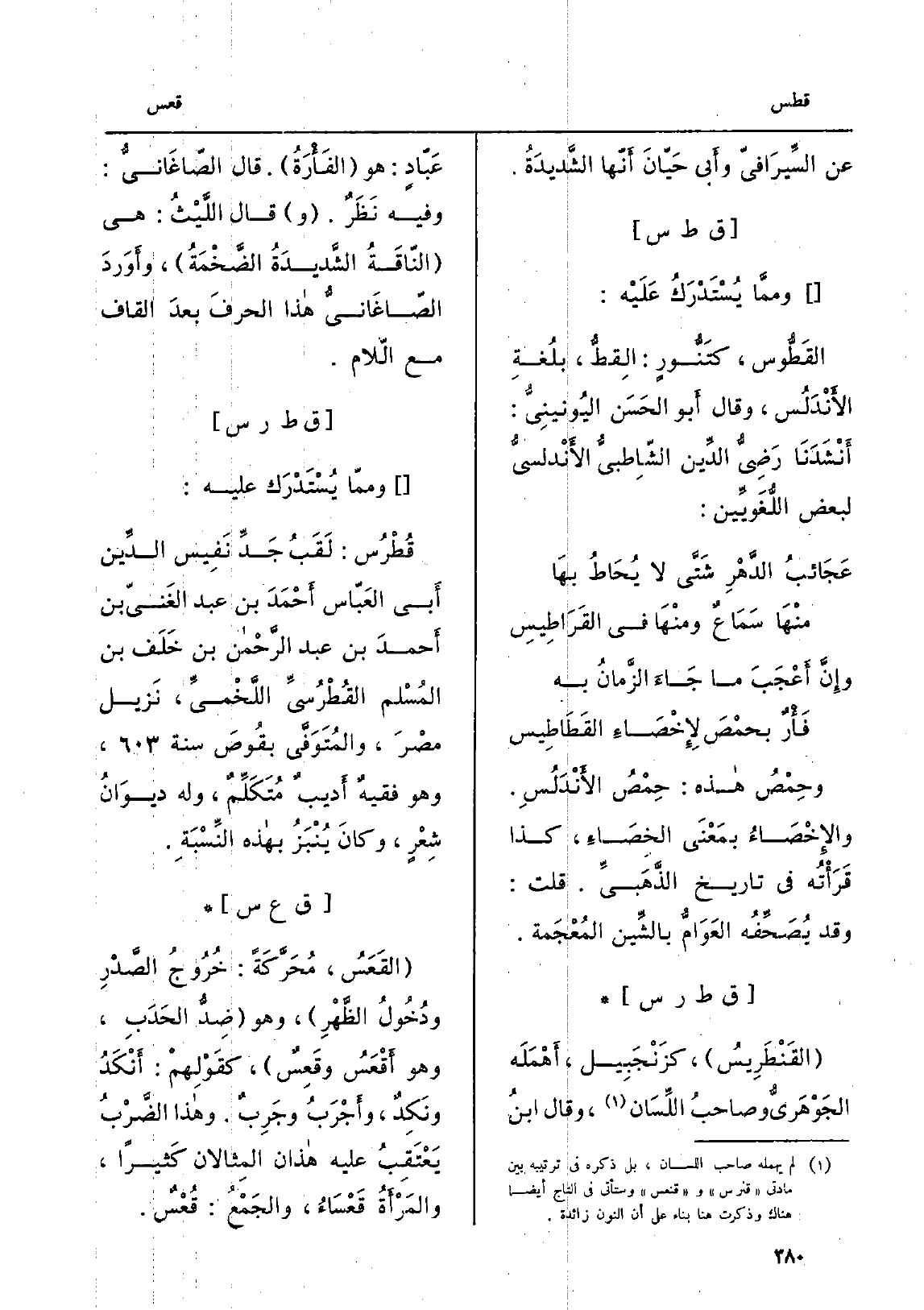 وممَّا يُسْتَدْرَكُ عَلَيْه: القَطُّوس، كتَنُّورٍ: القِطُّ، بلُغةِ الأَنْدَلُس، وَقَالَ أَبو الحَسَن اليُونينِيُّ: أَنْشَدَنَا رَضِيُّ الدِّين الشِّاطبيُّ الأَنْدلسيُّ لبَعض اللُّغَويِّين: