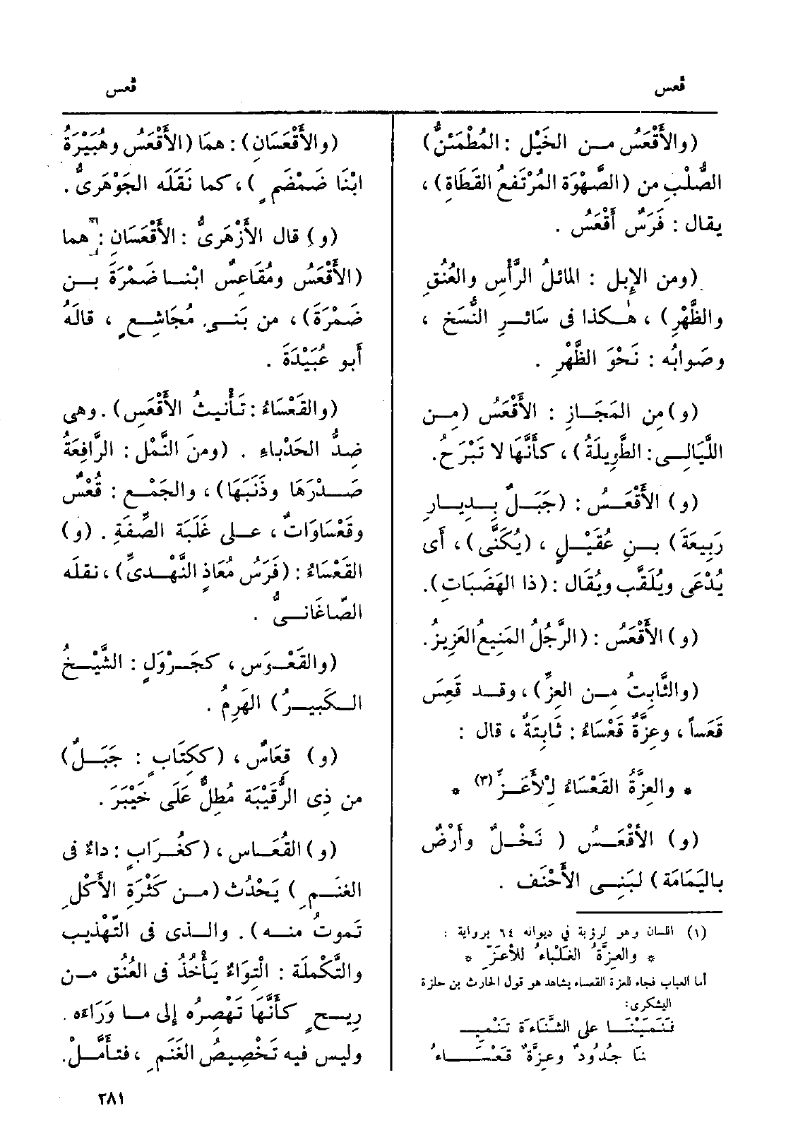 ومِن المَجَازِ: الأَقْعَسُ مِن اللّيَالِي: الطَّوِيلَةُ، كأنَّهَا لَا تَبْرَحُ. والأقْعَسُ جَبَلُ بِدِيارِ رَبِيعَةَ بنِ عُقَيْلٍ، يُكَنَّى، أَي يُدْعَى ويُلَقَّب ويُقَال: ذَا الهَضَبَاتِ. والأقْعَسُ: الرَّجُلُ المَنِيعُ العَزِيزُ. والثَّابِتُ مِن العِزِّ، وَقد قَعِسَ قَعَساً، وعِزَّةٌ قَعْسَاءُ: ثَابِتَةٌ، قَالَ: والعِزَّةُ القَعْسَاءُ لِلأَعَزِّ والأَقْعَسُ نَخْلٌ وأَرْضٌ باليَمَامَة لبَنِي الأَحْنَف. والأَقْعَسَانِ: همَا الأَقَعَسُ وهُبَيْرَةُ ابْنَا ضَمْضَمٍ، كَمَا نَقَلَه الجَوْهَرِيُّ. وَقَالَ الأَزْهَريُّ: الأَقْعَسَانِ: هما الأَقْعَسُ ومُقَاعِسٌ ابْنا ضَمْرَةَ بنِ ضَمْرَةَ، من بَني مُجَاشِعٍ، قالَهُ أَبو عُبَيْدَةَ. والقَعْسَاءُ: تَأْنيثُ الأَقْعَسِ. وَهِي ضِدُّ الحَدْباءِ. ومنَ النَّمْل: الرَّافِعَةُ صَدْرَهَا وذَنَبَهَا، والجَمْع: قُعْسٌ قَعْسَاوَاتٌ، على غَلَبَة الصِّفَةِ. والقَعْسَاءُ: فَرَسُ مُعَاذٍ النَّهْدِيِّ، نقلَه الصّاغَانيُّ. والقَعْوَسِ، كجَرْوَلٍ: الشَّيْخُ الكَبيرُ الهَرِمُ. وقِعَاسٌ، ككِتَابٍ: جَبَلٌ من ذِي الرُّقَيْبَة مُطِلٌّ عَلَى خَيْبَرَ. والقُعَاس، كغُرَابٍ: داءٌ فِي الغنَمِ يَحْدُث من كَثْرَةِ الأَكْلِ تَموتُ مِنْهُ. وَالَّذِي فِي التّهْذيب والتَّكْملَة: إلْتِوَاءٌ يَأْخُذُ فِي العُنُق من رِيحٍ كأَنَّهَا تَهْصِرُه إِلى مَا وَرَاءَه وَلَيْسَ فِيهِ تَخْصِيصُ الغَنَمِ، فتأَمَّلْ.