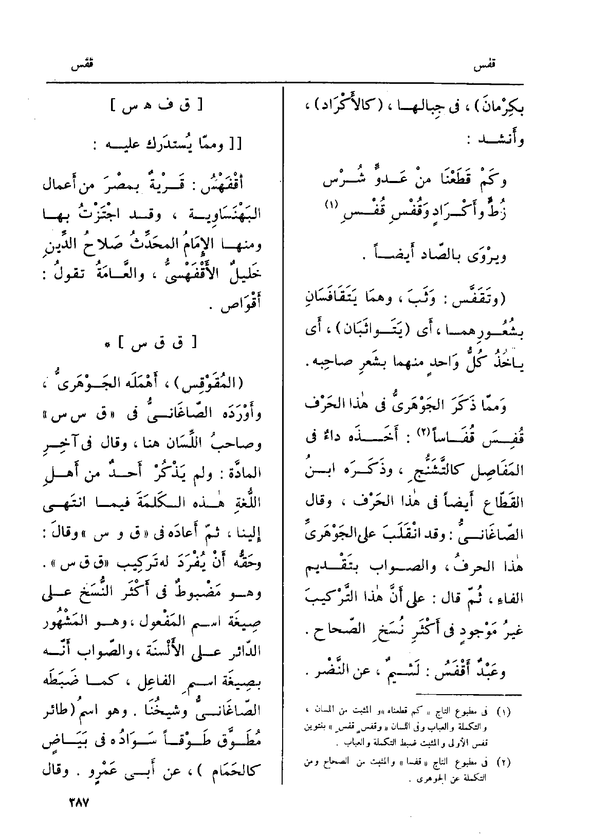 وممّا ذَكَرَ الجَوْهَريُّ فِي هَذَا الحَرْف قُفِسَ قُفَاساً: أَخَذَه داءٌ فِي المَفَاصِل كالتَّشَنُّجِ، وذَكَرَه ابنُ القَطّاع أَيضاً فِي هَذَا الحَرْف، وَقَالَ الصّاغَانيُّ: وَقد انْقَلَبَ على الجَوْهَريِّ هَذَا الحرفُ، وَالصَّوَاب بتَقْديم الفاءِ، ثُمّ قَالَ: على أَنَّ هَذَا التَّرْكيبَ غيرُ مَوْجودٍ فِي أَكْثَرِ نُسَخِ الصّحاح.