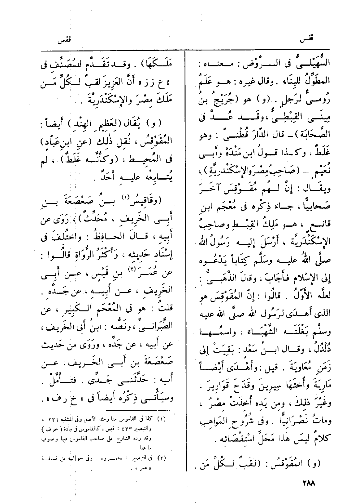 السُّهَيْليُّ فِي الرَّوْض: مَعْنَاهُ: المطَوِّلُ للبِنَاءِ. وَقَالَ غَيره: هُوَ عَلَمٌ رُوميٌّ لرَجلٍ. وَهُوَ جُرَيْجُ بنُ مِينَى القِبْطِيُّ، وقَد عُدَّ فِي الصَّحَابَة قَالَ الدّارَقُطْنىّ: وَهُوَ غَلَطٌ، وَكَذَا قولُ ابْن مَنْدَهْ وأَبى نُعَيْمٍ صَاحِبُ مِصْرَ والإِسْكَنْدريَّةِ، ويقَال: إِنَّ لهُم {مُقَوْقِسَ آخَرَ صَحابيّاً، جاءَ ذِكْره فِي مُعْجَم ابنِ قانعٍ، هُوَ مَلِكُ القِبْطِ وصاحِبُ الإِسْكَنْدَريَّة، أَرسَلَ إِليه رَسُولُ اله صلَّى اللهُ عَلَيْهِ وٍِ سَلَّم كِتَاباً يَدْعُوه إِلَى الإِسْلام فأَجَابَ، وقالَ الذَّهَبيُّ: لعلَّه الأَوّلُ. قالُوا: إِنّ المُقَوْقِسَ هُوَ الَّذِي أَهدَى لرَسُول الله صلَّى الله عَلَيْهِ وسلَّم بَغْلَتَه الشَّهْبَاءَ، واسمُها دُلْدُلُ، وَقَالَ ابنُ سَعدٍ: بَقِيَتْ إِلَى زَمَنِ مُعَاويَةَ. قيل: وأَهْدَى أَيْضاً مَارِيَةَ وأُختَهَا سِيرِينَ وقَدَحَ قَوَارِيرَ، وغَيْرَ ذلِكَ، ومِن يَدِه أُخِذَتْ مِصْرُ، وماتُ نَصْرَانيّاً. وَفِي شُرُوحِ المَواهِب كلامٌ ليسَ هَذَا مَحَلَّ اسْتِقْصَائِهِ.