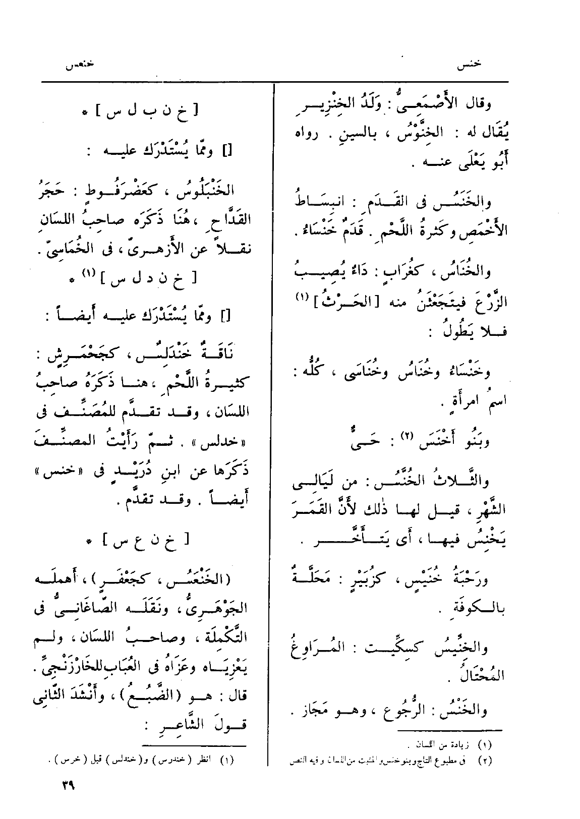 وَقَالَ الأَصْمَعِيُّ: وَلَدُ الخِنْزِيرِ يُقَال لَهُ: الخِنَّوْسُ، بالسينِ. رَوَاهُ أَبُو يَعْلَى عَنهُ. والخَنَسُ فِي القَدَمِ: انبِسَاطُ الأَخْمَصِ وكَثْرةُ اللَّحْمِ. قَدَمٌ خَنْسَاءُ. والخُنَاسُ، كغُرَابٍ: دَاءٌ يُصِيبُ الزَّرْعَ فيتَجَعْثَنُ مِنْهُ الحَرْثُ فَلَا يَطُولُ: وخَنْسَاءُ وخُنَاسُ وخُنَاسَى، كُلُّه: اسمُ امرأَةٍ.