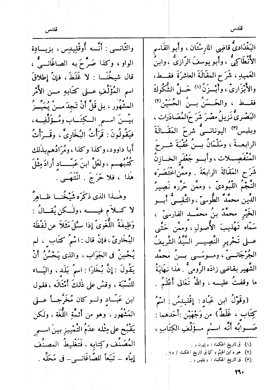 وقَوْلُ ابْن عَبّادٍ: إِقْليدِسُ: اسْمُ كِتَابٍ، غَلَطٌ من وَجْهَيْن: أَحَدهما: صَوابُه أَنًّه اسمُ مؤَلِّفِ الكِتَابِ، والثّاني: أَنَّه أُوقْلِيدِس، بزيادِة الْوَاو، وَكَذَا صَرَّحَ بِهِ الصاغَانيُّ، قَالَ شيخُنا: لَا غَلَطَ، فإنّ إِطلاقَ اسْم المُؤَلِّفِ على كتَابهِ من الأَمْر الْمَشْهُور، بل قَلَّ أَ، ْ تَجِدَ منْ يُمَيِّزُ بيْنَ اسمِ الكِتَاب ومُؤَلِّفِه، فيَقُولُونَ: قَرَأْتُ البُخَارِيَّ، وقَرَأْتُ أَبا دَاوُود، وَكَذَا وَكَذَا، ومُرَادُهم بذلك كُتُبُهم، ولعلَّ ابنَ عَبّادٍ أَراد مِثْلَ هَذَا، فَلَا حَرَجَ. انْتَهَى.