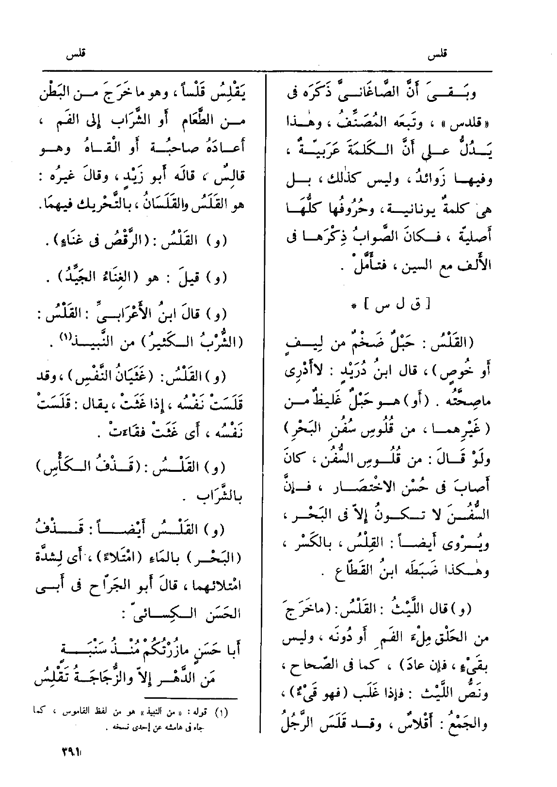 وبَقىَ أَنَّ الصَّاغَانيَّ ذَكَره فِي قلدس، وتَبعَه المُصَنِّفُ، وَهَذَا يَدُلُّ على أَنَّ الكَلمَةَ عَرَبيّةٌ، وفيهَا زَوائدُ، وَلَيْسَ كَذَلِك، بل هِيَ كلمةٌ يونانية، وحُرُوفُها كلُّهَا) أَصليّة، فكانَ الصَّوابُ ذِكْرَها فِي الأَلف مَعَ السن، فتأَمَّلْ.