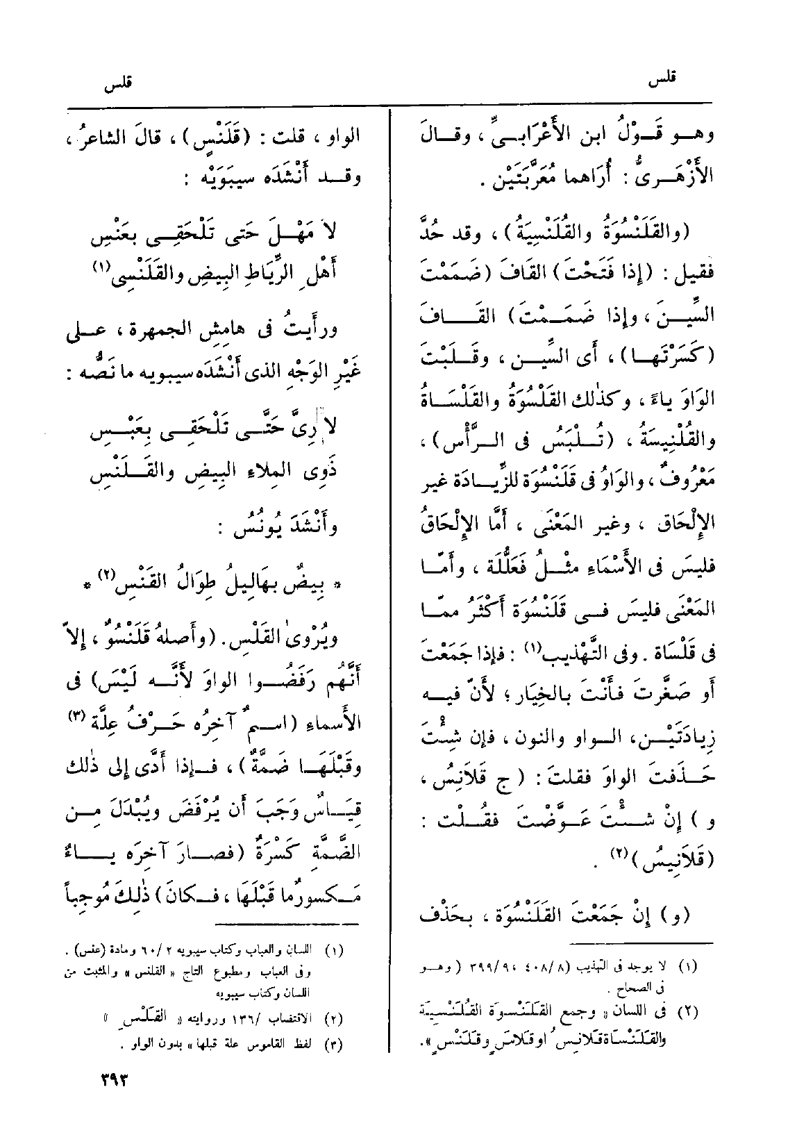 وَإِن جَمَعْتَ القَلَنْسُوَة، بحَذف الْوَاو، قلت: قَلَنْسٍ، قالَ الشاعرُ، وَقد أَنْشَدَه سيبويْه: لَا مَهْلَ حَتى تَلْحَقِي بعَنْسِ أَهْلِ الرِّيَاطِ البِيضِ والقَلَنْسِي ورأيتُ فِي هامِشِ الجمهرة، على غَيْر الوَجْهِ الَّذِي أَنْشَدَه سِيبَوَيْهٍ مَا نَصُّه: لَا رِيَّ حَتَّى تَلْحَقِي بِعَبْس ذَوِي المِلاءِ البِيضِ والقَلَنْسِ وأَنْشَدَ يُونُسُ: بِيضٌ بهَالِيلُ طِوَالُ القَنْسِ)