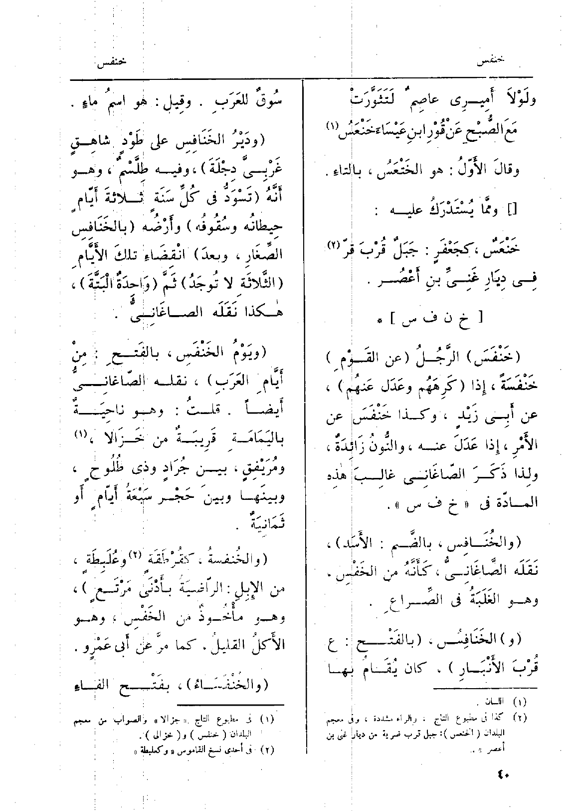 خَنْفَسَ الرَّجُلُ عَن القَوْمِ خَنْفَسَةً، إِذا كَرِهَهُم وعَدَل عَنهُم، عَن أَبِي زَيْدٍ، وَكَذَا خَنْفَسَ عَن الأَمْرِ، إِذا عَدَلَ عَنهُ، والنُّونُ زَائِدَةٌ، ولِذا ذَكَرَ الصّاغَانِي غالِبَ هذِه المادّة فِي خَ ف س. والخُنَافِس، بالضَّم: الأَسَد، نَقَلَه الصَّاغَانِيُّ، كَأَنَّهُ من الخَفْسِ، وَهُوَ الغَلَبَةُ فِي الصِّراعِ. والخَنَافِسُ، بالفَتْح: ع. قُرْبَ الأَنْبَارِ. كَانَ يُقَامُ بهَا سُوقٌ للعَرَبِ، وقِيل: هُوَ اسمُ ماءٍ. ودَيْرُ الخَنَافِسِ عل طُوْدٍ شاهِقٍ غَرْبِيَّ دِجْلَةَ، وَفِيه طِلَّسْم، وَهُوَ أَنَّهُ تَسْوَدُّ فِي كُلِّ سَنَةٍ ثلاثةَ أَيّامٍ حِيطانُه وسُقُوفُه، وأَرْضُه بالخَنَافِسِ الصِّغَارِ، وبعدَ، انْقِضَاءِ تلكَ الأَيَّامِ الثَّلاثَةِ لَا تُوجَدُ ثَمَّ وَاحِدَةٌ الْبَتَّةَ، هَكَذَا نَقَلَه الصاغَانِيُّ. ويَوْمُ الخَنْفَسِ، بالفَتْحِ: مِنْ أَيَّامِ العَرَبِ، نَقله الصّاغانِيُّ أَيضاً، قلتُ: وَهُوَ ناحِيَةٌ باليَمَامَةِ قَرِيبَةٌ من خَزَالا، ومُرَيْفِقٍ، بَين جُرَادٍ وَذي طُلُوحٍ، وبينَها وبينَ حَجْر سَبْعَةُ أَيّامٍ أَو ثَمَانِيَةٌ. والخُنفسةُ، كقُرْطَقَةٍ وعُلَبِطَةٍ، من الإِبِلِ: الرّاضِيَةُ بأَدْنَى مَرْتَعٍ، وَهُوَ مأْخُوذٌ من الخِفْسِ، وَهُوَ الأَكلُ القليلُ، كَمَا مرَّ عَن أَبي عَمْرٍ و. والخُنْفَسَاءُ، بفَتْح الفاءِ