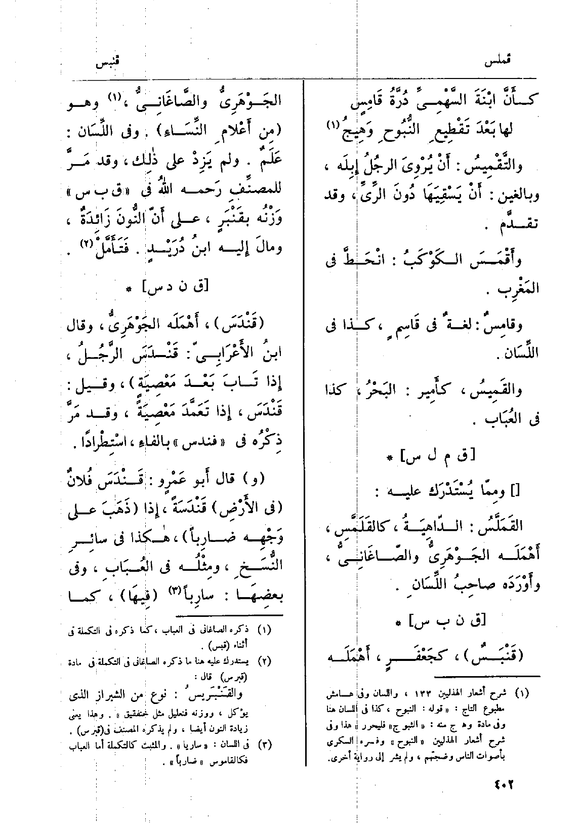 قَنْبَسٌ، كجَعْفَرٍ، أهْمَلَه الجَوْهَرِيُّ والصَّاغَانِيُّ، وَهُوَ مِن أَعْلامِ النِّسَاءِ. وَفِي اللِّسَان: عَلَمٌ. وَلم يَزِدْ على ذلِك، وَقد مَرَّ للمصنِّفِ رَحمه اللهُ فِي ق ب س، وَزْنُه بقَنْبَرٍ، على أَنّ النُّونَ زَائِدَةٌ، ومالَ إِليه ابنُ دُرَيْدٍ. فَتَأَمَّلْ.