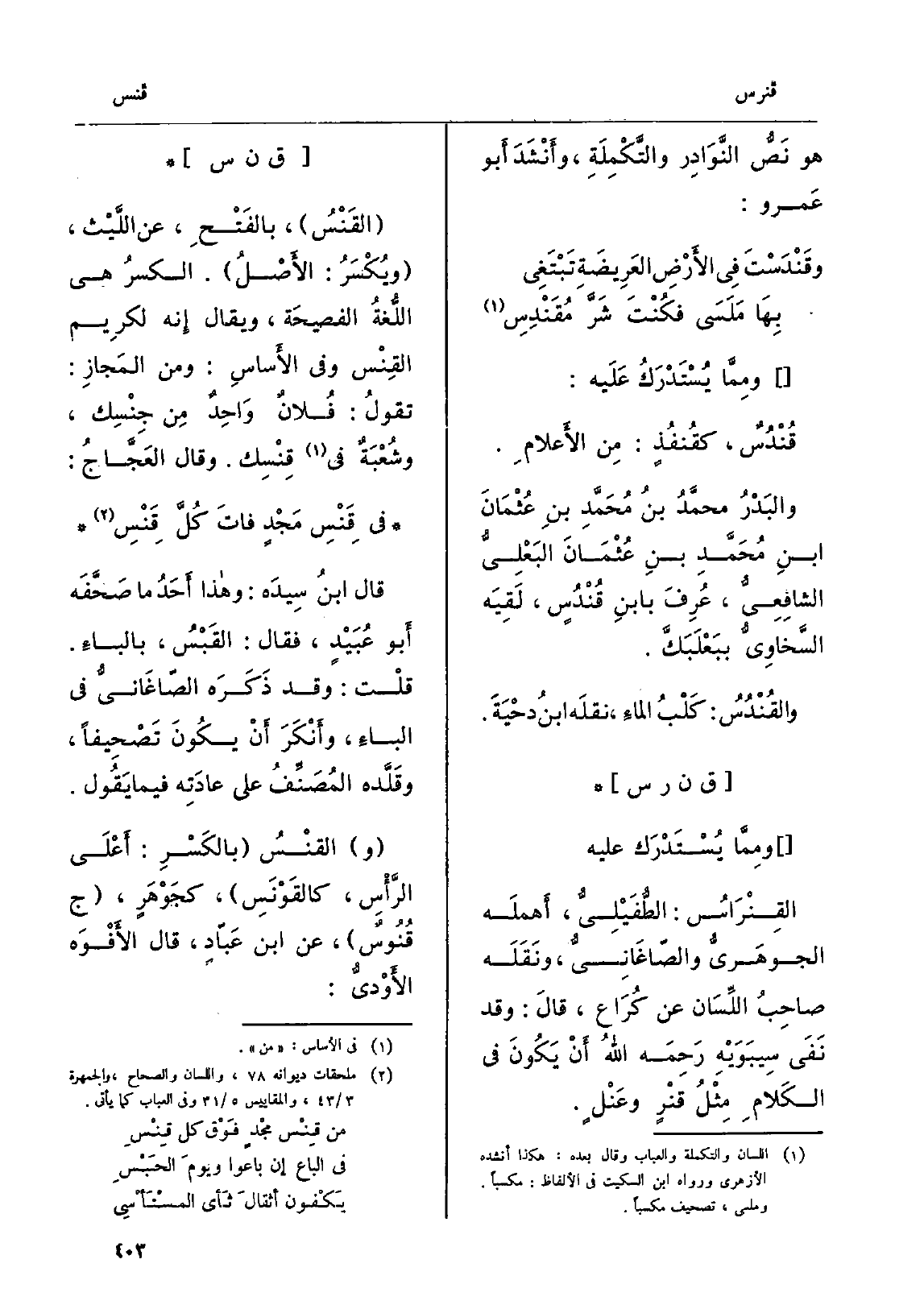 القَنْسُ، بالفَتْحِ، عَن اللَّيْث، ويُكْسَرُ: الأَصْلُ. الكسرُ هِيَ اللُّغةُ الفصيحَة، وَيُقَال إِنه لكرِيم القِنْس وَفِي الأَساسِ: وَمن المَجازِ: تقولُ: فُلانٌ وَاحِدٌ مِن جِنْسِك، وشُعْبَةٌ فِي قِنْسِك. وَقَالَ العَجَّاجُ: فِي قَنْسِ مَجْدٍ فاتَ كُلَّ قَنْسِ قَالَ ابنُ سِيدَه: وَهَذَا أَحَدُ مَا صَحَّفَه أَبو عُبَيْدٍ، فَقَالَ: القَبْسُ، بالباءِ. قلْت: وَقد ذَكَرَه الصّاغَانِيُّ فِي الباءِ، وأَنْكَرَ أَنْ يكُونَ تَصْحِيفاً، وقَلَّده المُصَنِّفُ على عادَته فِيمَا يَقُول. والقَنْسُ بالكَسْرِ: أَعْلَى الرَّأْسِ، كالقَوْنَس، كجَوْهَرٍ، ج قُنُوسٌ، عَن ابْن عَبّاد، قَالَ الأَفْوَه الأَوْديُّ: