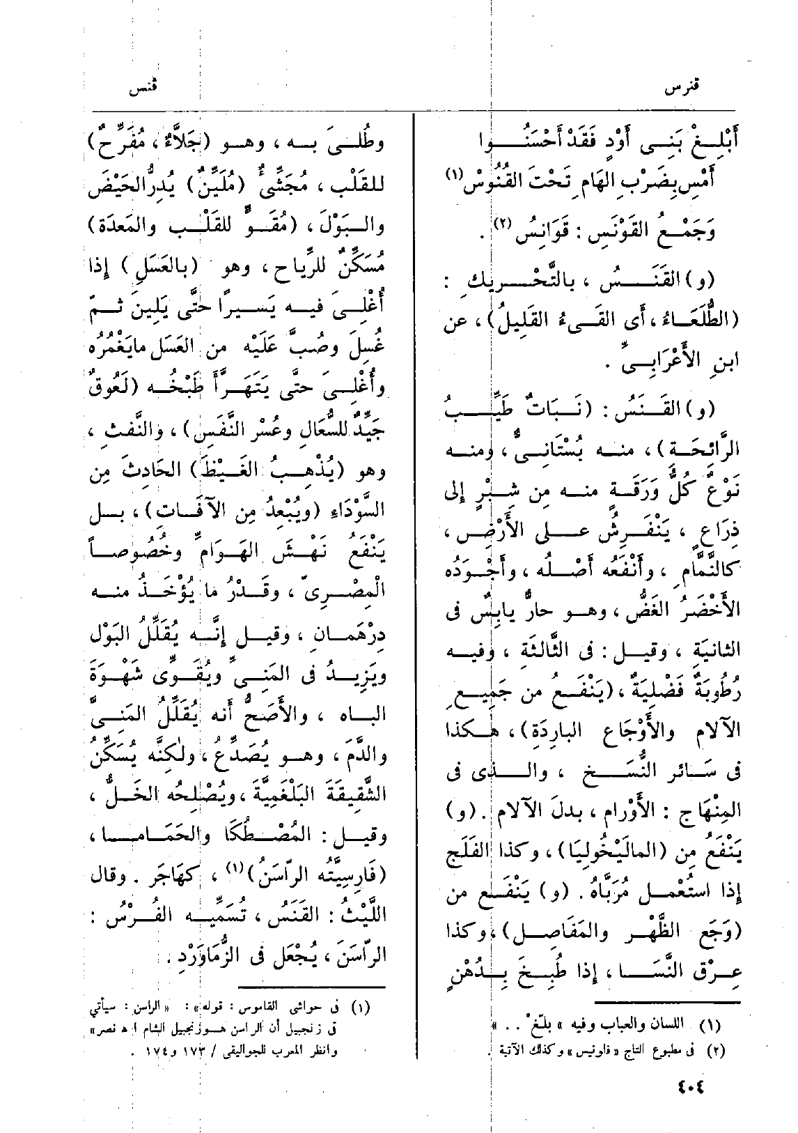 والقَنَسُ: نَبَاتٌ طَيِّبُ الرَّائِحَةِ، مِنْهُ بُسْتَانِيُّ، وَمِنْه نَوْعٌ كُلُّ وَرَقَةٍ مِنْهُ مِن شِبْرٍ إِلى ذِرَاعٍ، يَنْفَرِشُ على الأَرْضِ، كالنَّمَّامِ، وأَنْفَعُه أَصْلُه، وأَجْوَدُه الأَخْضَرُ الغَضُّ، وَهُوَ حارٌّ يابِسٌ فِي الثانيَةِ، وَقيل: فِي الثَّالثَةِ، وَفِيه رُطُوبةٌ فَضْلِيَةٌ، يَنْفَعُ من جَمِيعِ الآلام والأَوْجَاع البارِدَةِ، هَكَذَا فِي سَائر النُّسَخ، وَالَّذِي فِي المِنْهَاج: الأَوْرام، بدلَ الآلام. ويَنْفَعُ مِن المالَيْخُولِيَا، وَكَذَا الفَلَج إِذا إستُعْمل) مَرَبَّاهُ. ويَنْفَع من وَجَع الظَّهْر والمَفَاصِل، وَكَذَا عِرْق النَّسَا، إِذا طُبخَ بِدُهْنٍ وطُليَ بِهِ، وَهُوَ جَلاَّءٌ، مُفَرِّحٌ للقَلْب، مَجَشِّيءٌ مَلَيِّنٌ يَدِرُّ الحَيْضَ والبَوْلَ، مُقَوٍّ للقَلْب والمَعدَة مُسَكِّنٌ للرِّياح، وَهُوَ بالعَسَلِ إِذا أُغْلِيَ فِيهِ يَسيراً حتَّى يَلِينَ ثمّ غُسِلَ وصُبَّ عَلَيْه من العَسَل مَا يَغْمُرُه وأُغْلِيَ حتَّى يَتَهَرَّأَ طَبْخُه لَعُوقٌ جَيِّدٌ للسُّعَالِ وعُسْر النَّفَسِ، والنِّفثِ، وَهُوَ يُذْهِبُ الغَيْظَ الحَادِثَ مِن السَّوْدَاءِ ويُبْعِدُ مِن الآفَاتِ، بل يَنْفَعُ نَهْشَ الهَوَامِّ وخُصُوصاً الْمِصْرِيّ، وقَدْرُ مَا يُؤْخَذُ مِنْهُ دِرْهَمانِ، وَقيل إِنَّه يُقَلِّلُ البَوْل ويَزِيدُ فِي المَنِيِّ ويُقَوِّي شَهْوَةَ الباه، والأَصَحُّ أَنه يُقَلِّلُ المَنِيَّ والدَّمَ، وَهُوَ يُصَدِّعُ، ولكِنَّه يُسَكِّنُ الشَّقِيقَةَ البَلْغَمِيَّةَ، ويُصْلِحُه الخَلُّ، وَقيل: المُصْطُكَا والحَمَاما، فَارِسِيَّتُه الرّاسَنُ، كهَاجَر. وَقَالَ اللَّيْثُ: القَنَسُ، تُسّمَّيه الفُرْسُ: الرّاسَنَ، يُجْعَل فِي الزُّمَاوَرْدِ.