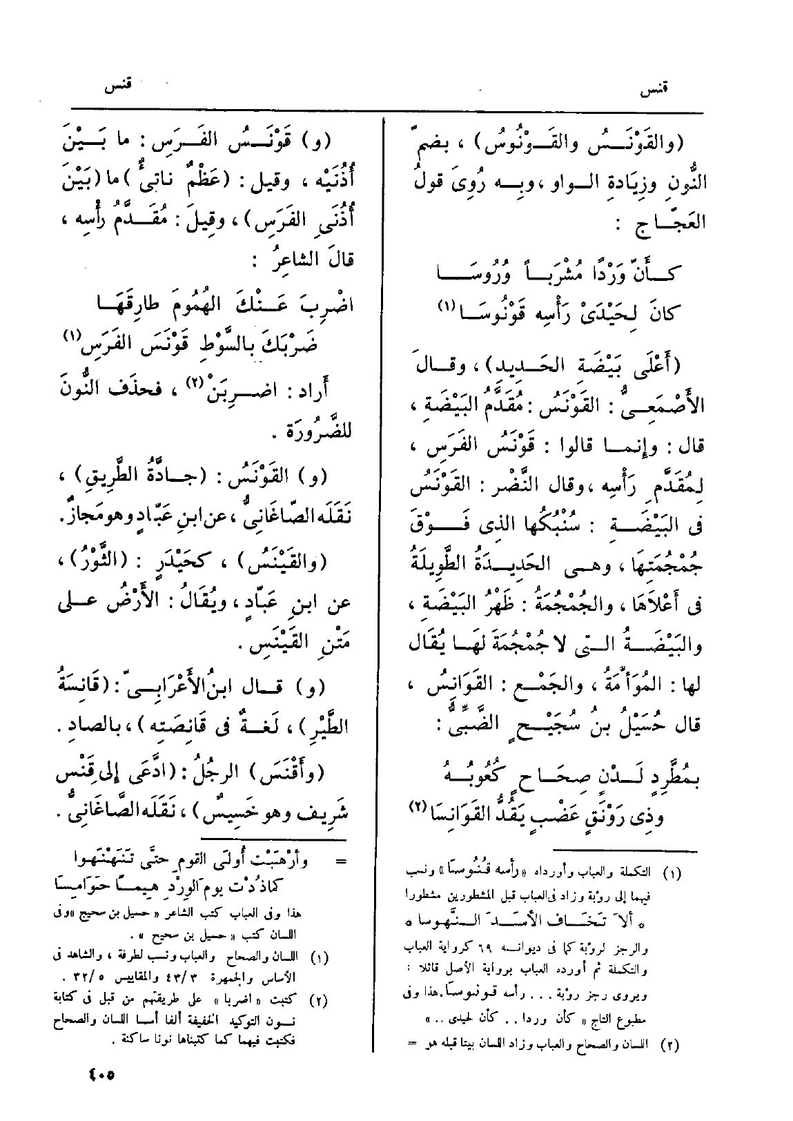 أَراد: اضرِبَنْ، فحذَف النُّونَ للضَّرُورَة. والقَوْنَسُ: جادَّةُ الطَّرِيقِ، نَقَلَه الصّاغَانِيُّ، عَن ابنِ عَبّادٍ وَهُوَ مَجازٌ. والقَيْنَسُ، كحَيْدَرٍ: الثَّوْرُ، عَن ابنِ عَبّادٍ، ويُقَالُ: الأَرْضُ على مَتْنِ القَيْنَسِ. وَقَالَ ابنُ الأَعْرَابِيّ: قَانِسَةُ الطَّيْرِ، لَغةٌ فِي قَانِصَتِه، بالصادِ. وأَقْنَسَ الرجُلُ: إدَّعَى إِلى قَنْس شَرِيف وَهُوَ خَسِيسٌ، نَقَلَه الصَّاغَانِيُّ.