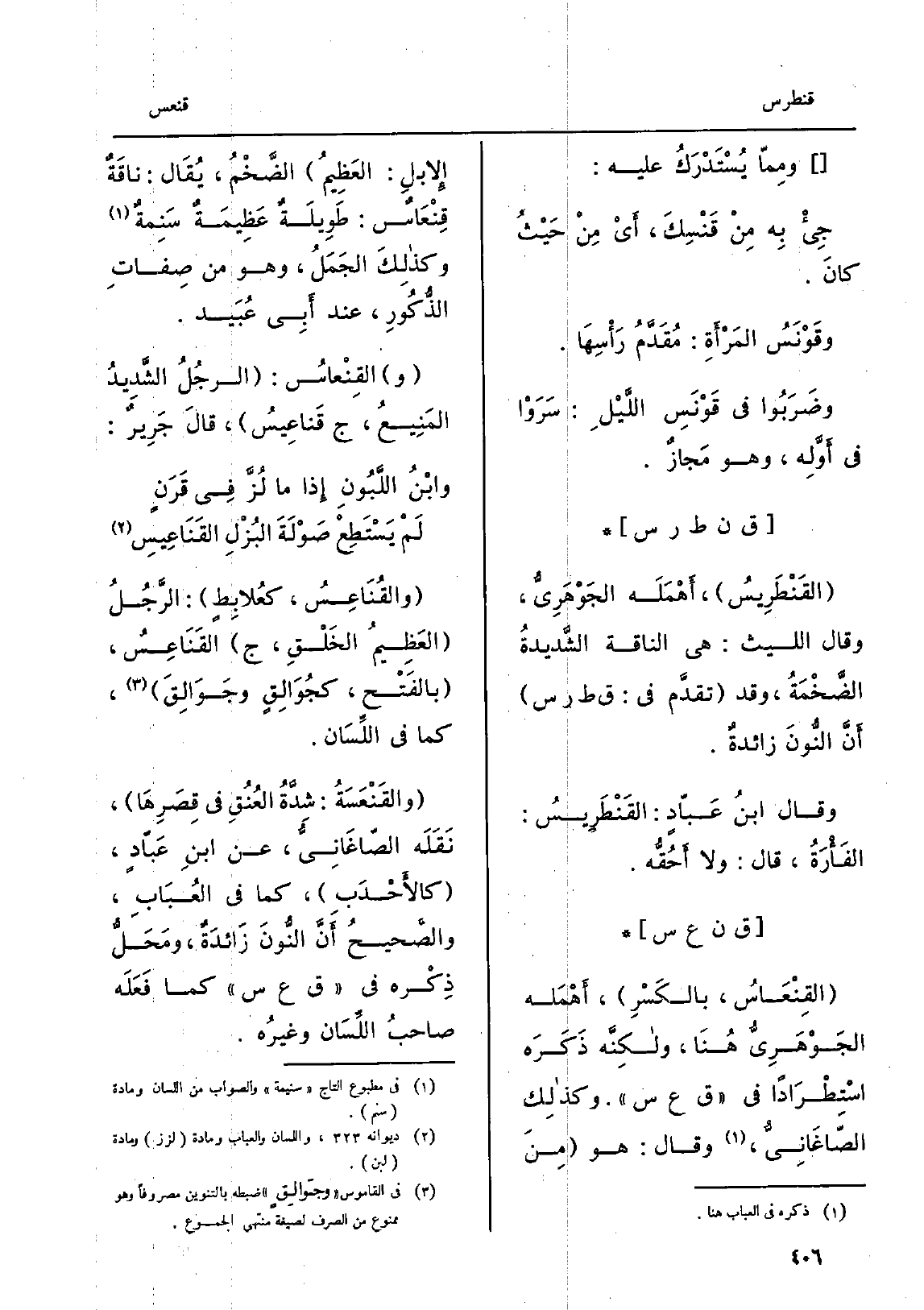 القِنْعَاسُ، بالكَسْرِ، أَهْمَله الجَوْهَرِيُّ هُنَا، ولكِنَّه ذَكَرَه إسْتِطْرَاداً فِي ق ع س. وكذلِك الصّاغَانِيُّ، وَقَالَ: هُوَ مِنَ الإِبلِ: العَظِيمُ الضَّخْمُ، ويُقَال: ناقَةٌ قِنْعَاسٌ: طَوِيلَةٌ عَظِيمَةٌ سَنِمةٌ وكذلِكَ الجَمَلُ، وَهُوَ من صِفاتِ الذُّكُورِ، عِنْد أَبِي عُبَيد. والقِنْعاسُ: الرجُلُ الشَّدِيدُ المَنِيعُ، ج قَناعِيسُ، قالَ جَرِيرٌ: