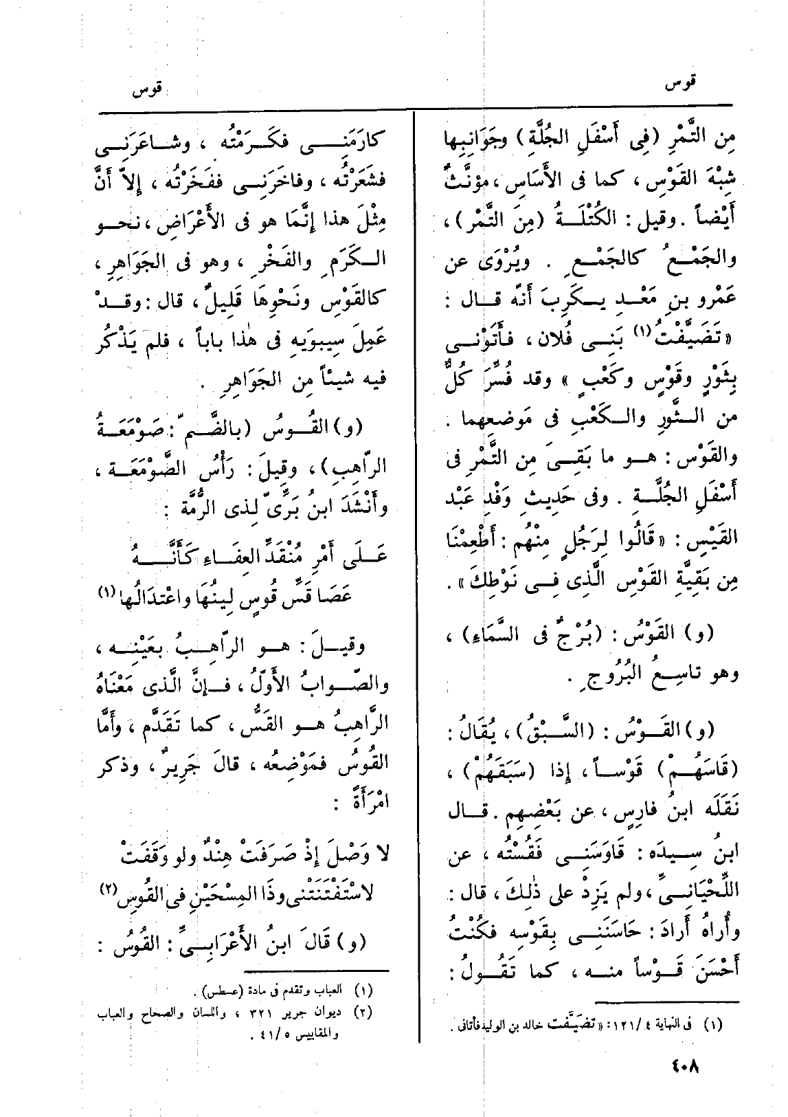 والقَوْسُ: السَّبْقُ، يُقَالُ: قَاسَهُمْ {قَوْساً، إِذا سَبَقَهُمْ، نَقَلَه ابنُ فارِسٍ، عَن بَعْضِهِم. قَالَ ابنُ سِيدَه:} قَاوَسَنِي {فَقُسْتُه، عَن اللِّحْيَانِيِّ، وَلم يَزِدْ على ذلِكَ، قَالَ: وأُراهُ أَرادَ: حَاسَنَنِي} بِقَوْسِه فكُنْتُ أَحْسَنَ {قَوْساً مِنْهُ، كَمَا تَقُولُ: كارَمَني فكَرَمْتُه، وشاعَرَنِي فشَعَرْتُه، وفاخَرَنِي ففَخَرْتُه، إِلاّ أَنَّ مِثْلَ هَذَا إِنَّمَا هُوَ فِي الأَعْرَاضِ، نَحْو الكَرَمِ، والفَخْرِ، وَهُوَ فِي الجَوَاهِرِ،} كالقَوْسِ ونَحْوِهَا قَلِيلٌ، قَالَ: وقدْ عَمِلَ سِيبوَيهِ فِي هَذَا بَابا، فَلم يَذْكُر فِيهِ شَيْئا مِن الجَوْاهِرِ. (و) {القُوسُ بالضَّمّ: صَوْمَعَةُ الرّاهِبِ، وقِيلَ: رَأْسُ الصُّوْمَعَة، وأَنْشَدَ ابنُ بَرِّيّ لِذي الرُّمَّة: