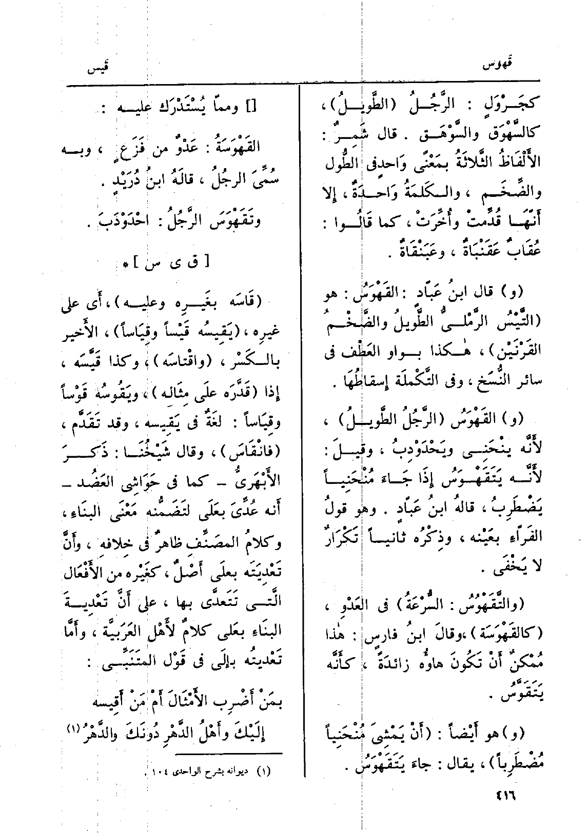 ُ كجَرْوَلٍ: الرَّجُلُ الطَّويلُ، كالسَّهْوَق والسَّوْهَق. قَالَ شَمِرٌ: الأَلْفَاظُ الثَّلاثَةُ بمَعْنىً وَاحدٍ فِي الطُّول والضِّخَم، والكَلمَةُ وَاحدةٌ، إِلا أَنّهَا قُدِّمتْ وأُخَّرَتْ، كَمَا قَالُوا: عُقَابٌ عَقَنْبَاةٌ، وعَبَنْقَاةٌ. وَقَالَ ابنُ عَبّادٍ: القَهْوَسُ: هُوَ التَّيْسُ الرَّمْليُّ الطَّويلُ والضَّخْمُ القَرْنَيْن، هَكَذَا بواو العطْف فِي سَائِر النُّسَخ، وَفِي التَّكْملَة إِسقاطُهَا. والقَهَوَسُ الرَّجُلُ الطَّويلُ، لأَنَّه ينْحَنِي ويحْدَوْدِبُ، وقيلَ: لأَنَّه يَتَقَهْوَسُ إِذَا جَاءَ مُنْحَنِياً يَضْطَرِبُ، قالهُ ابنُ عَبّادٍ. وَهُوَ قولُ الفَرّاءِ بعَيْنه، وذِكُرُه ثَانِيًا تَكْرَارٌ لَا يَخْفَى. والتَّقَهْوُسُ: السُّرْعَةُ فِي العَدْوِ، كالقَهْوَسَة، وقالَ ابنُ فارسٍ: هَذَا مُمْكنٌ أَنْ تَكُونَ هاؤُه زائدَةً، كأَنَّه يَتَقَوَّسُ. وَهُوَ أَيْضاً: أَنْ يَمْشِيَ مُنْحَنِياً مُضْطَرِباً، يُقَال: جاءَ يَتَقَهْوَسُ. وممّا يُسْتَدْرَك عَلَيْهِ: القَهْوَسَةُ: عَدْوٌ من فَزَعٍ، وَبِه سُمَّيَ الرجُلُ، قالَهُ ابنُ دُرَيْدٍ.