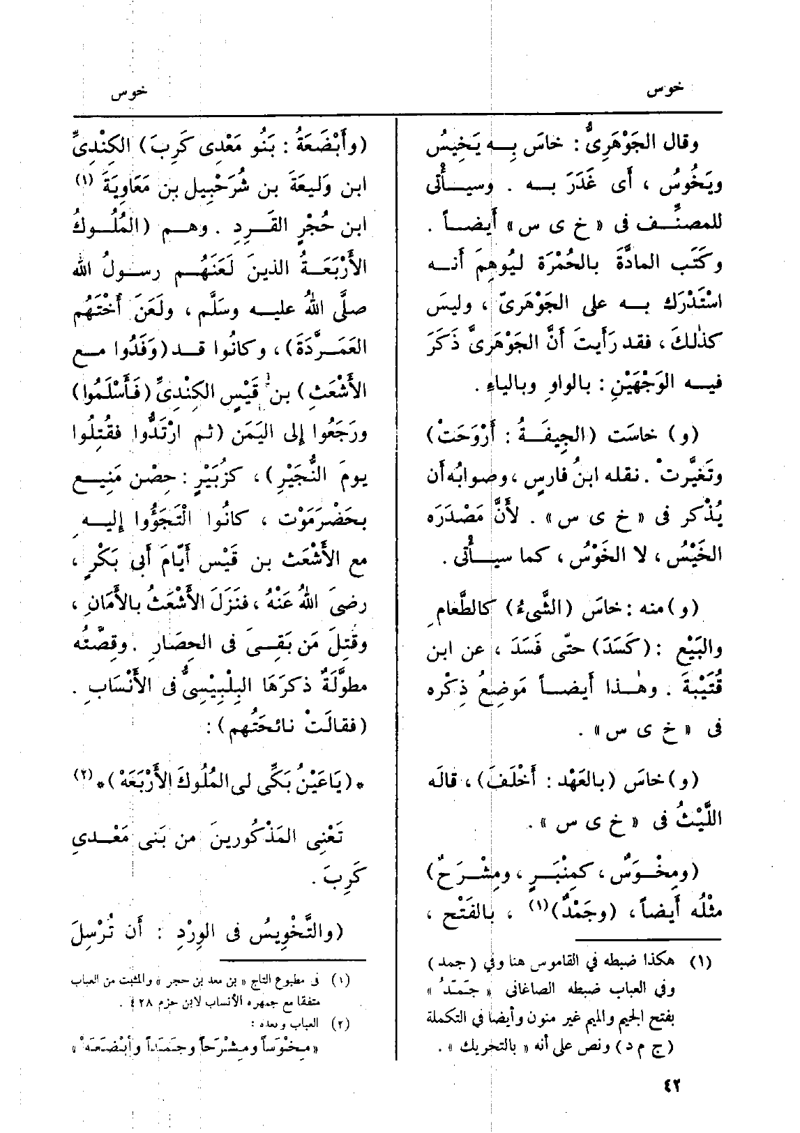 وكَتَب المادَّةَ بالحُمْرَة ليُوهِمَ أَنه اسْتَدْرَك بِهِ على الجَوْهَرِيّ، وليسَ كذلكَ، فقد رَأَيتَ أَنَّ الجَوْهَريَّ ذَكَرَ فِيهِ الوَجْهَيْنِ: بالواوِ وبالياءِ. (و) {خاسَت الجِيفَةُ: أَرْوَحَتْ وتَغيَّرتْ: نَقله ابنُ فارسٍ، وصوابُه أَن يُذْكر فِي خَ ي س. لأَنَّ مَصْدَرَه الخَيْسُ، لَا} الخَوْسُ، كَمَا سيأْتِي. ومنهَ: خاسَ الشَّيءُ كالطَّعامِ والبَيْع: كَسَدَ حتّى فَسَدَ، عَن ابْن قُتَيْبةَ. وَهَذَا أَيضاً مَوضِعُ ذِكْره فِي خَ ي س. وخاسَ بالعَهْد أخْلَفَ، قالَه اللَّيْثُ فِي خَ ي س {ومِخْوَسٌ، كمِنْبَرٍ، ومِشْرَحٌ مثْلُه أَيْضا، وجَمْدٌ، بالفَتْح، وأَبْضَعَةُ: بَنُو مَعْدِي كَرِبَ الكِنْدِيِّ ابْن وَليعَةَ بن شُرَحْبِيل بن مَعَاوِيَةَ، ابْن حُجْرٍ القَرِدِ. وهم المُلُوكُ الأَرْبَعَةُ الذينَ لَعَنَهُم رسولُ الله صلَّى اللهُ عَلَيْهِ وسَلِّم، ولَعَنَ أَخْتَهُمْ العَمَرَّدَةَ، وكانُوا قد وَفَدُوا مَعَ الأَشْعَثِ بن قَيْسٍ الكِنْدِيِّ فَأَسْلَمُوا ورَجَعُوا إِلَى اليَمَن ثمَّ ارْتَدُّوا فقُتِلُوا يومَ النُّجَيْرِ، كزُبَيْرٍ: حِصْن مَنِيع بحَضْرَمَوْت، كانُوا الْتَجَؤُوا إِليهِ مَعَ الأَشْعَث بن قَيْس أَيّامَ أَبي بَكْرٍ، رضيَ اللهُ عَنْهُ، فَنَزَلَ الأَشْعَثُ بالأَمَانِ، وقتِلَ مَن بَقِيَ فِي الحِصَارِ. وقِصَّتُه مطوَّلَةٌ ذكرَهَا البِلْبِيسِيُّ فِي الأَنْسَابِ. فقالَتْ نائحَتُهم: يَا عَيْنُ بَكِّي لي المُلُوكَ الأَرْبَعَهْ. تَعْنِي المَذْكُورينَ من بَني مَعْدِيِ كَرِبَ.} والتَّخْوِيسُ فِي الوِرْدِ: أَن تُرْسِل