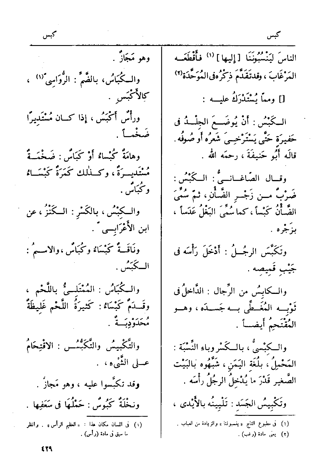 َ الناسَ ليَنْسُبُونَنَا إِليها فأَقْطَعَه المَرْغَابَ، وتَقَدَّمَ ذِكْرُه فِي المُوَحَّدَة وممّا يُسْتَدْرَكُ عَلَيْهِ: الكَبْسُ: أَنْ يُوضَعَ الجِلْدُ فِي حَفِيرَةٍ حَتَّى يَسْتَرْخِيَ شَعرُه أَو صُوفُه. قالَه أَبُو حَنيفَةَ، رحمَه الله. وَقَالَ الصّاغانيُّ: الكَبْسُ: ضَرْبٌ من زَجْرِ الضَّأْنِ، ثمّ سُمِّيَ الضَّأْنُ كَبْساً، كَمَا سُمِّيَ البَغْلُ عَدَساً، بزَجْره. وتَكَبَّسَ من الرِّجال: أَدْخَلَ رَأْسَه فِي جَيْبِ قَمِيصِه. والكابِسُ من الرِّجال: الدَّاخلُ فِي ثَوْبِه المُغَطِّي بِهِ جِسدَه، وَهُوَ المُقْتَحِمُ أَيضاً. والكْبِسيُّ، بالكَسْر وباءِ النِّسْبَة: المَحْمِلُ، بِلُغَةِ اليَمَنِ، شَبَّهُوه بالبَيْت الصَّغير قَدْرَ مَا يُدْخِلُ الرجُلُ رأْسَه. وتَكْبِيسُ الجَسَدِ: تَلْيِينُه بالأَيْدي، وَهُوَ مَجَازٌ. والكُبَاسُ، بالضَّمِّ: الرُّوَاسِيّ كالأَكْبَسِ. ورأْسٌ أَكْبَسُ، إِذا كَانَ مُسْتَدِيراً ضَخْماً. وهامَةٌ كُبْساءُ أَوْ كَبَاسٌ: ضَخْمَةٌ مُسْتَديرَةٌ، وَكَذَلِكَ كَمَرَةٌ كَبْسَاءُ وكُبَاسٌ. والكِبْسُ، بالكَسْرِ: الكَنْزُ، عَن ابْن الأَعْرَابِيّ. ونَاقَةٌ كَبْسَاءُ وكُبَاسٌ، والإِسمُ: الكَبَسُ. والكُبَاسُ: المُمْتَلِيءُ باللَّحْم، وقَدَمٌ كَبْسَاءُ: كَثيرةُ اللَّحْم غَلِيظَةٌ مُحَدَوْبَةٌ. والتَّكْبيسُ التَّكَبُّسُ: الإقْتِحَامُ على الشَّيْءِ،. وَقد تكبَّسوا عَلَيْهِ، وَهُوَ) مَجازٌ. ونخْلَةٌ كَبُوسٌ: حَمْلُهَا فِي سَعَفِها.