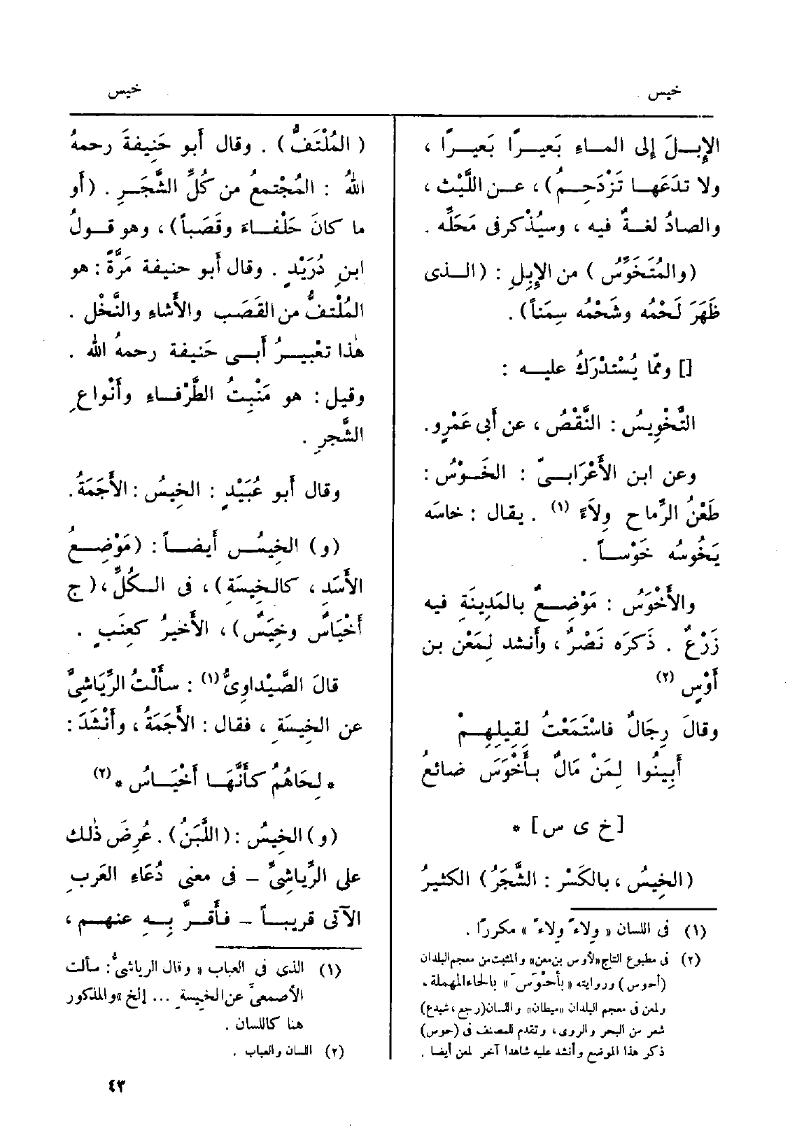 {الخِيسُ، بالكَسْر: الشَّجَرُ الكثيرُ المُلْتَفُّ. وَقَالَ أَبو حَنِيفةَ رحمهُ اللهُ: المُجْتمعُ من كُلِّ الشَّجَرِ. أَو مَا كانَ حَلْفاءَ وقَصَباً. وَهُوَ قولُ ابنِ دُرَيْدٍ. وَقَالَ أَبو حنيفَة مَرَّةً: هُوَ المُلْتفُّ من القَصَب والأَشَاءِ والنَّخْل. هَذَا تَعْبيرُ أَبي حَنيفة رحمهُ الله. وَقيل: هُوَ مَنْبِتُ الطَّرْفاءِ وأَنْواعِ الشَّجْرِ.