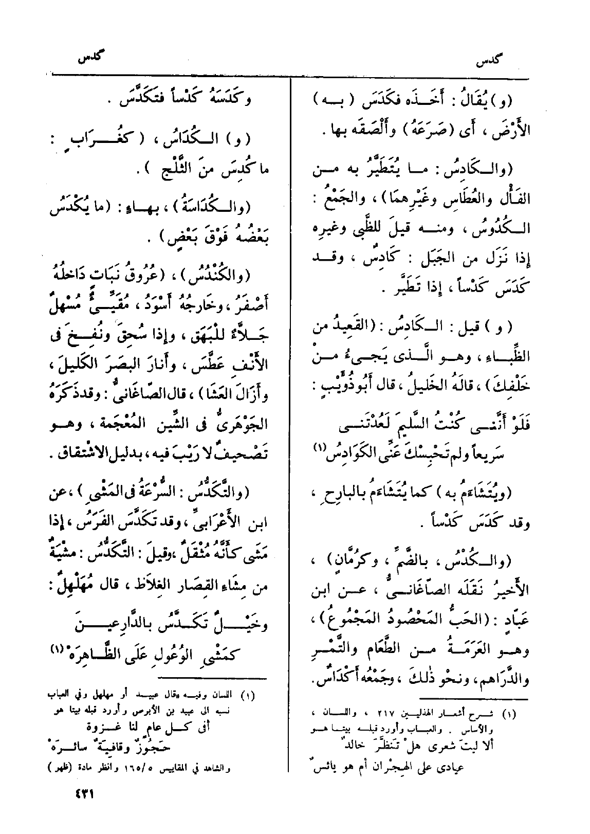 الثَّلْج. والكُدَاسَةُ، بهاءٍ: مَا يُكُدَسُ بَعْضُهُ فَوْقَ بَعضٍ. والكُنْدُسُ، عُرُوقُ نَبَاتٍ دَاخلُهُ أَصْفَرُ، وخَارجُهُ أَسْوَدُ، مُقَيِّيءٌ مُسْهلٌ جَلاَّءٌ للْبَهَق، وإِذا سُحِقَ ونُفِخَ فِي الأَنْفِ عَطَّسَ، وأَنارَ البصَرَ الكَليلَ، وأَزَالَ العَشَا، قَالَ الصّاغَانيُّ: وَقد ذَكَرَهُ الجَوْهَرِيُّ فِي الشَّين المُعْجَمة، وَهُوَ تَصْحيفٌ لَا رِيْبَ فِيهِ، بِدَلِيل الإِْشتقاق. والتَّكَدُّسُ: السُّرْعَةُ فِي المَشْيِ، عَن ابْن الأَعْرَابيِّ، وَقد تَكَدَّسَ الفَرَسُ، إِذا مَشَى كأَنَّهُ مُثْقَلٌ، وقيلَ: التَّكَدُّسُ: مشْيَةٌ من مِشَاءِ القِصَار الغِلاَظ، قَالَ مُهَلْهِلٌ: