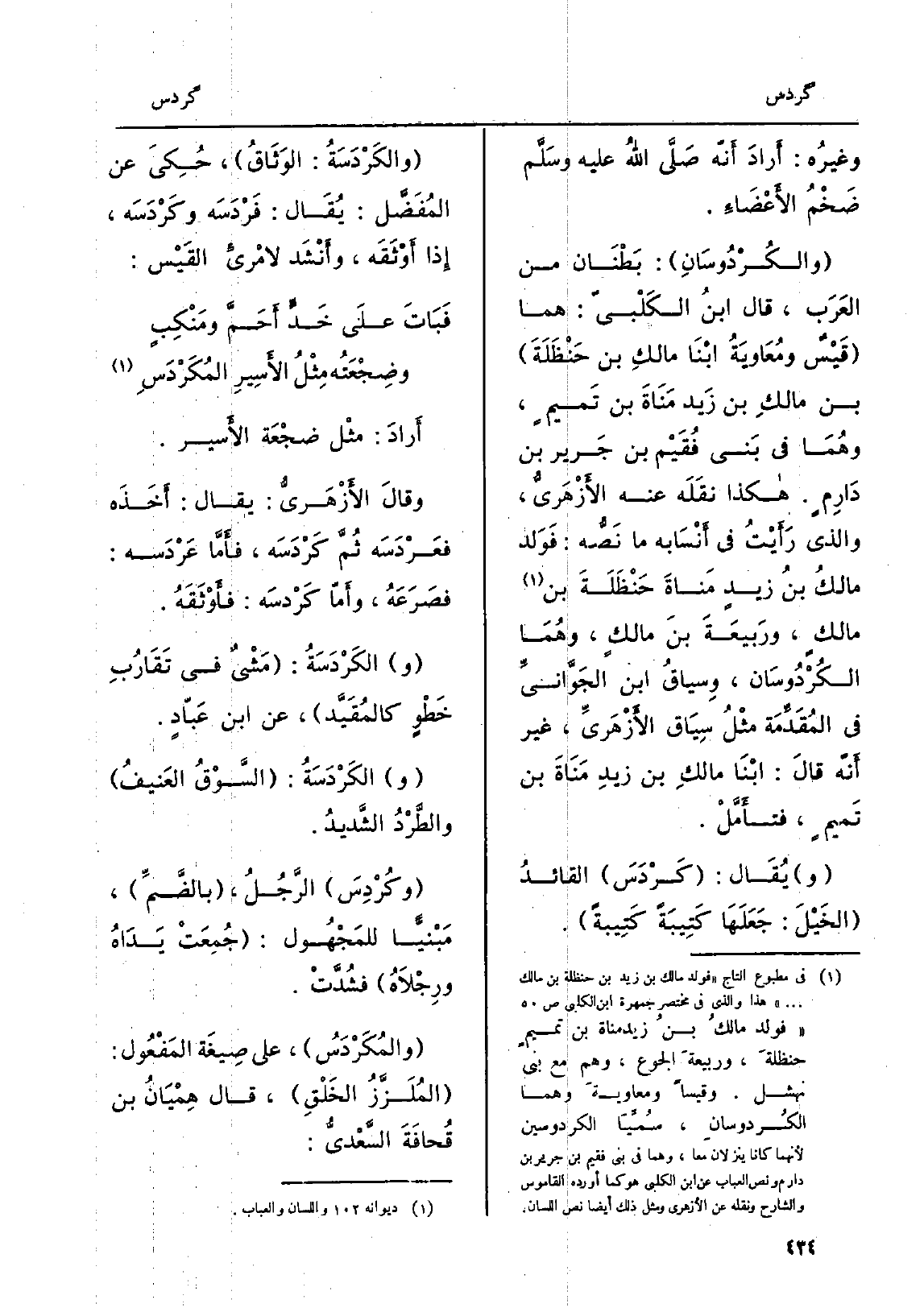 والكُرْدُوسَانِ: بَطْنَان من العَرَب، قَالَ ابنُ الكَلْبيّ: هما قَيْسٌ ومُعَاويَةُ ابْنَا مالكِ بن حَنْظَلَةَ بن مالكِ بن زَيد مَنَاةَ بن تَميمٍ، وهُمَا فِي بَني فُقَيْم بن جَرير بن دَارِمٍ. هَكَذَا نقَلَه عَنهُ الأَزْهَريُّ، وَالَّذِي رَأَيْتُ فِي أَنْسَابه مَا نَصُّه: فَوَلد مالكُ بنُ زيدٍ مَناةَ حَنْظَلَة بن مالكٍ، ورَبيعَةَ بن مالكٍ، وهُمَا الكُرْدُوسَان، وِسياقُ ابْن الجَوَّانيِّ فِي المُقَدِّمَة مثْلُ سِيَاق الأَزْهريِّ، غير أَنّه قالَ: ابْنَا مالكِ بن زيدِ مَنَاةَ بن تَميمٍ، فتأّمَّلْ. ويُقَال: كَرْدَسَ القائدُ الخَيْلَ: جَعَلَهَا كَتِيبَةً كَتِيبةً. والكَرْدَسَةُ: الوَثَاقُ، حُكِىَ عَن المُفَضَّل: يُقَال: فَرْدَسَه وكَرْدَسَه، إِذا أَوْثَقَه، وأَنْشَد لامْريءِ القَيْس: